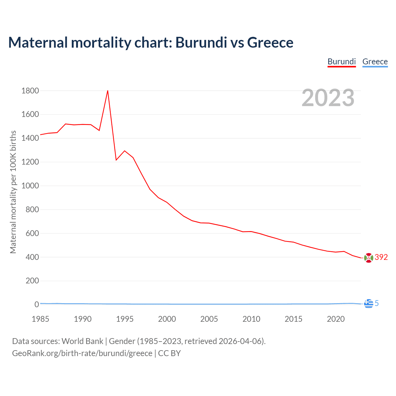 The maternal mortality rate, which is the probability of dying during childbirth or within 42 days of pregnancy termination, is 392 deaths per 100,000 live births in Burundi, compared to 5 deaths in Greece.