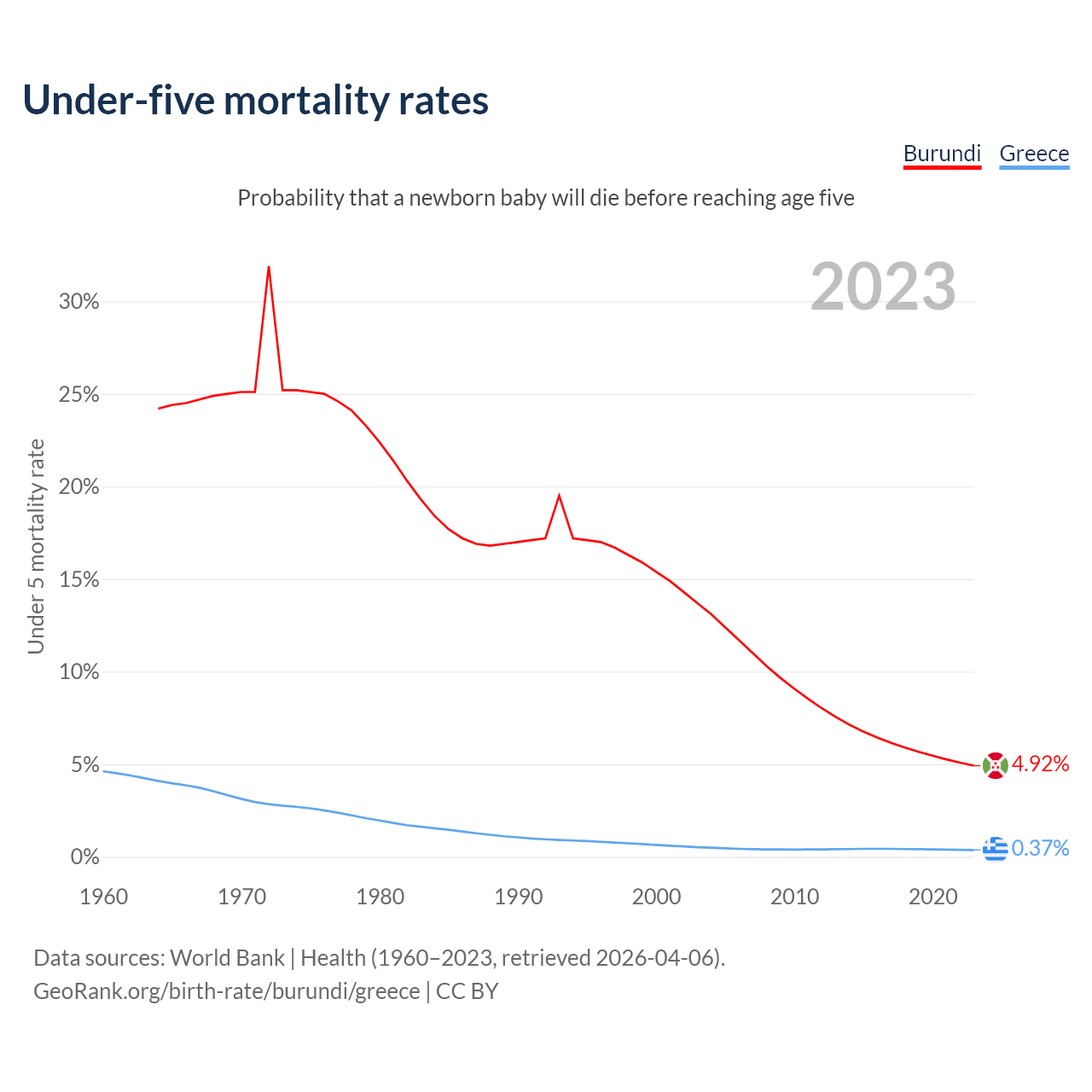 The chance that a newborn baby will die before reaching age five is 4.92% in Burundi and 0.37% in Greece. Above is a chart with historical data on under-five mortality rates.
