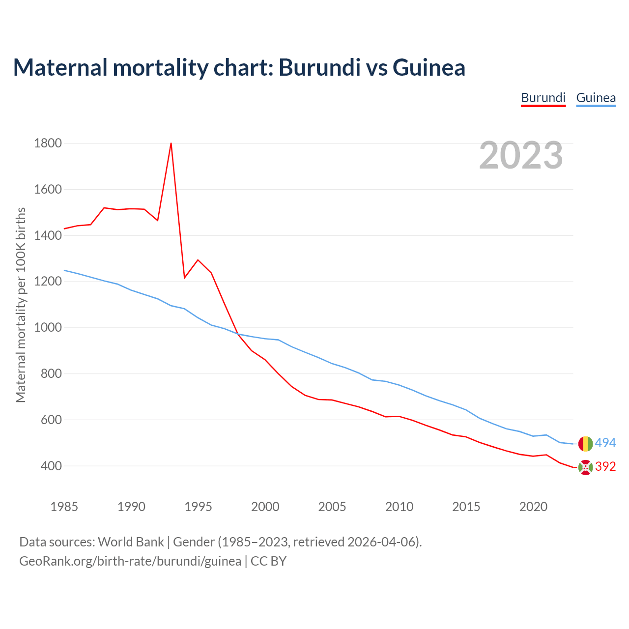 The maternal mortality rate, which is the probability of dying during childbirth or within 42 days of pregnancy termination, is 392 deaths per 100,000 live births in Burundi, compared to 494 deaths in Guinea.