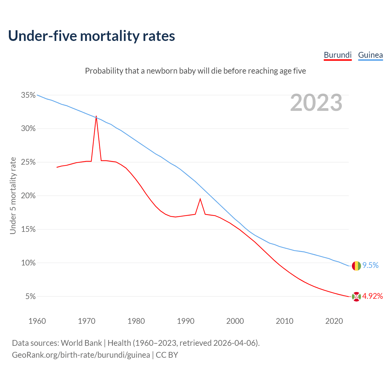 The chance that a newborn baby will die before reaching age five is 4.92% in Burundi and 9.5% in Guinea. Above is a chart with historical data on under-five mortality rates.