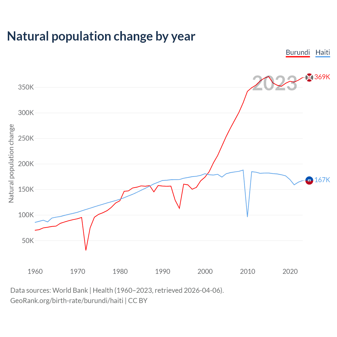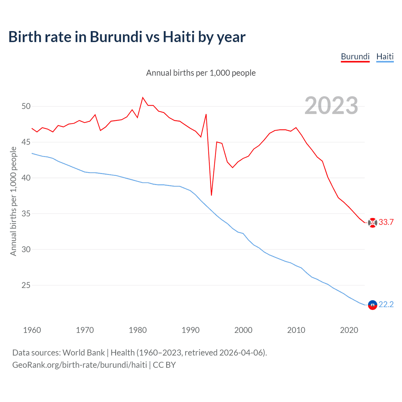 Burundi has an annual birth rate of 33.7 births per 1,000 people, compared to 22.2 for Haiti. The average number of children a woman is expected to have during her lifetime — the fertility rate, is 4.88 in Burundi and 2.66 in Haiti — 45.6% difference.