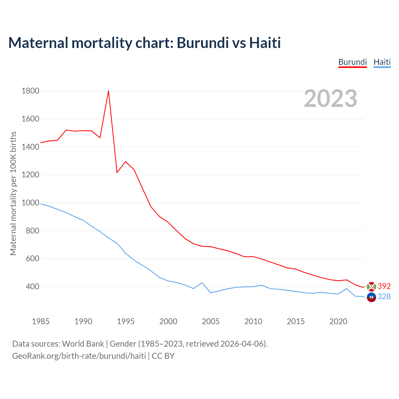 The maternal mortality rate, which is the probability of dying during childbirth or within 42 days of pregnancy termination, is 392 deaths per 100,000 live births in Burundi, compared to 328 deaths in Haiti.