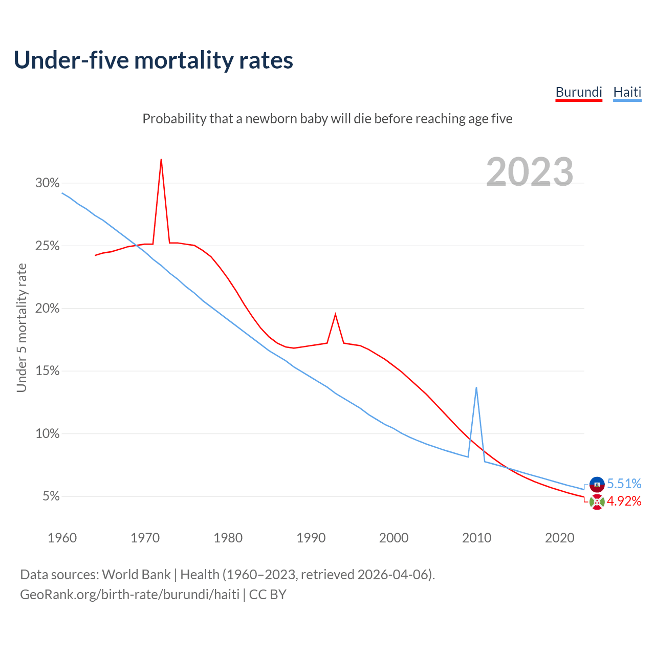 The chance that a newborn baby will die before reaching age five is 4.92% in Burundi and 5.51% in Haiti. Above is a chart with historical data on under-five mortality rates.