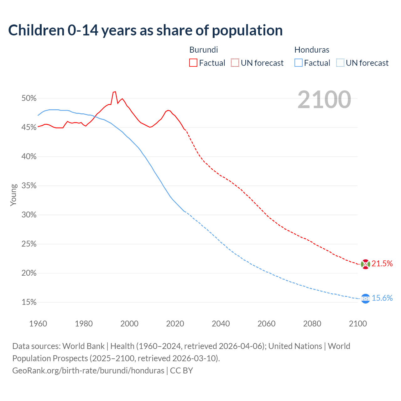 According to the latest available data on birth rates, the fertility rate in Burundi was 4.88 children per woman in 2023, compared to 2.5 in Honduras in 2023. The replacement level is considered to be 2.1 children per woman.