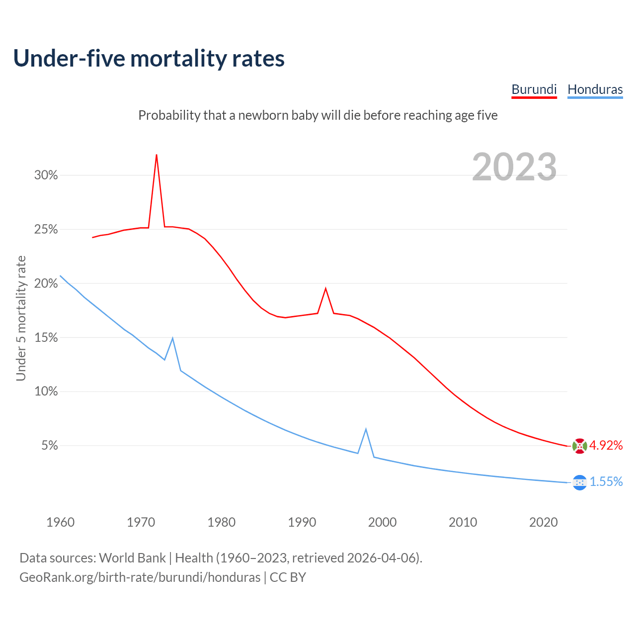 The chance that a newborn baby will die before reaching age five is 4.92% in Burundi and 1.55% in Honduras. Above is a chart with historical data on under-five mortality rates.