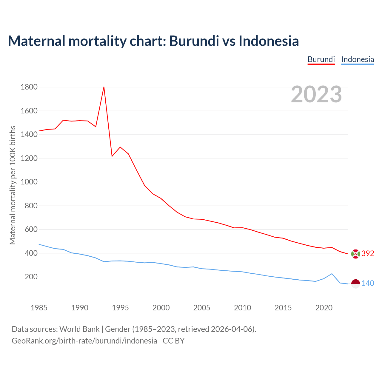 The maternal mortality rate, which is the probability of dying during childbirth or within 42 days of pregnancy termination, is 392 deaths per 100,000 live births in Burundi, compared to 140 deaths in Indonesia.
