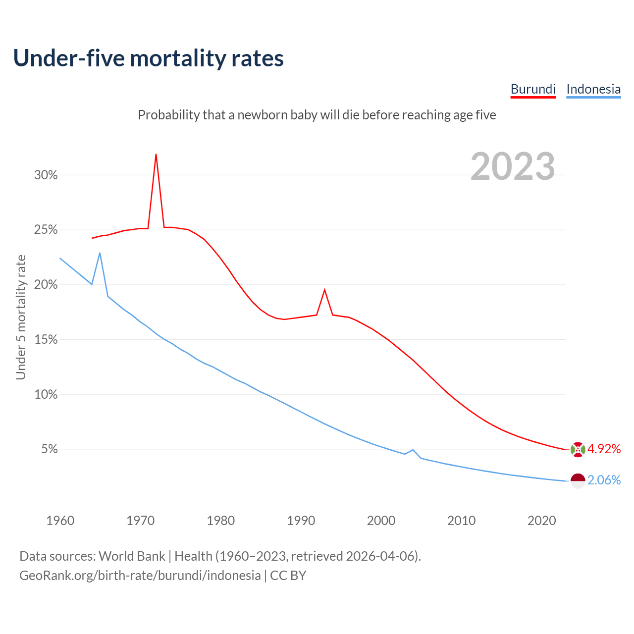 The chance that a newborn baby will die before reaching age five is 4.92% in Burundi and 2.06% in Indonesia. Above is a chart with historical data on under-five mortality rates.