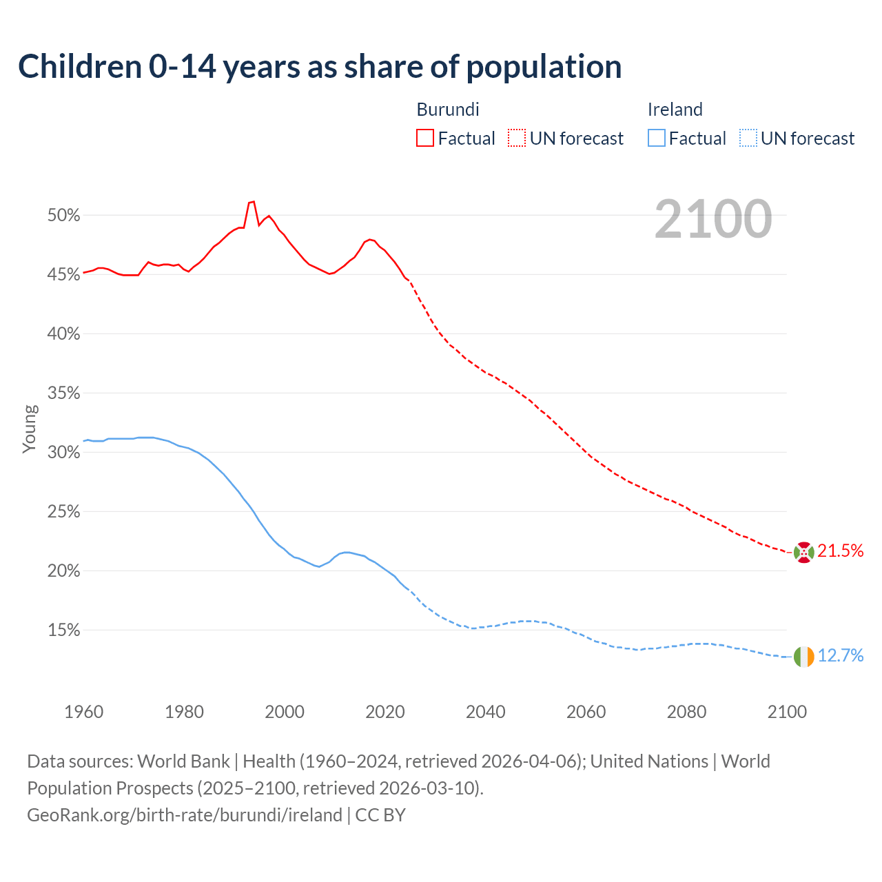 Burundi has an annual birth rate of 33.7 births per 1,000 people, compared to 10.3 for Ireland. The average number of children a woman is expected to have during her lifetime — the fertility rate, is 4.88 in Burundi and 1.5 in Ireland — 69.2% difference.