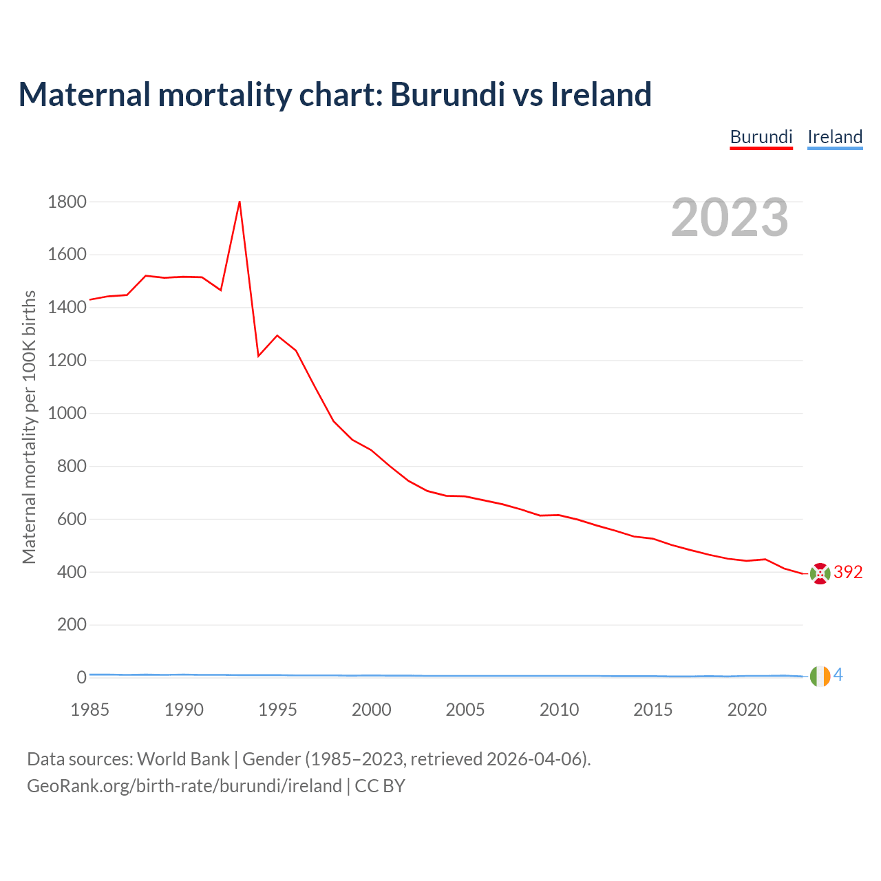 The maternal mortality rate, which is the probability of dying during childbirth or within 42 days of pregnancy termination, is 392 deaths per 100,000 live births in Burundi, compared to 4 deaths in Ireland.
