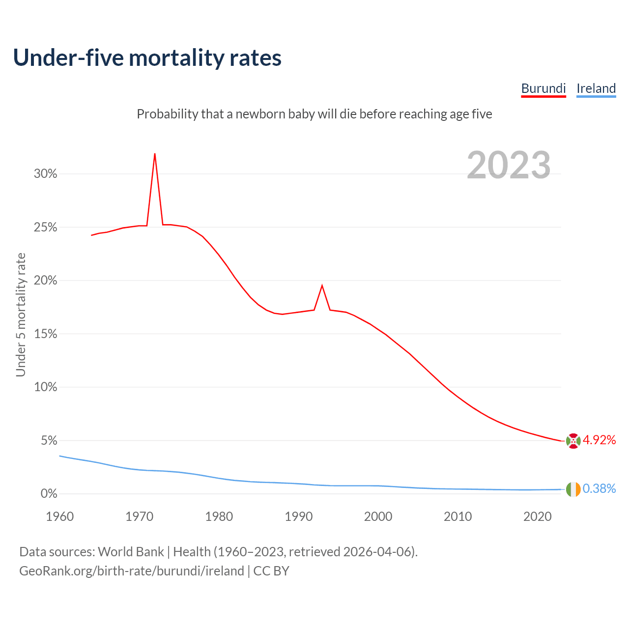 The chance that a newborn baby will die before reaching age five is 4.92% in Burundi and 0.38% in Ireland. Above is a chart with historical data on under-five mortality rates.