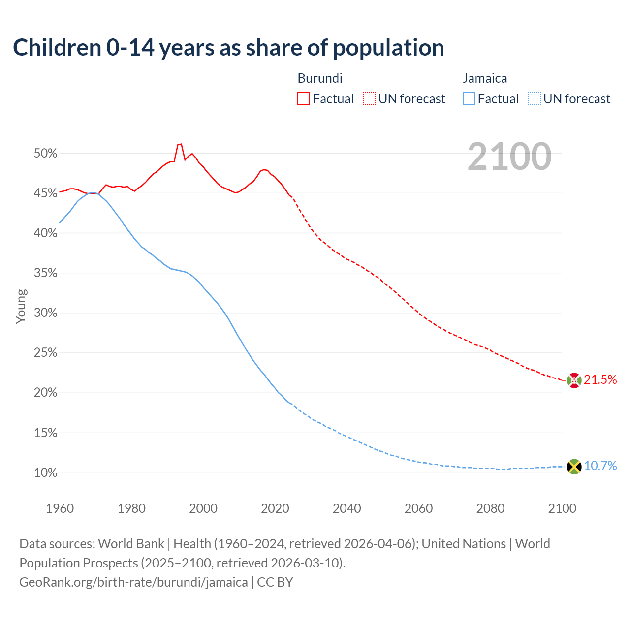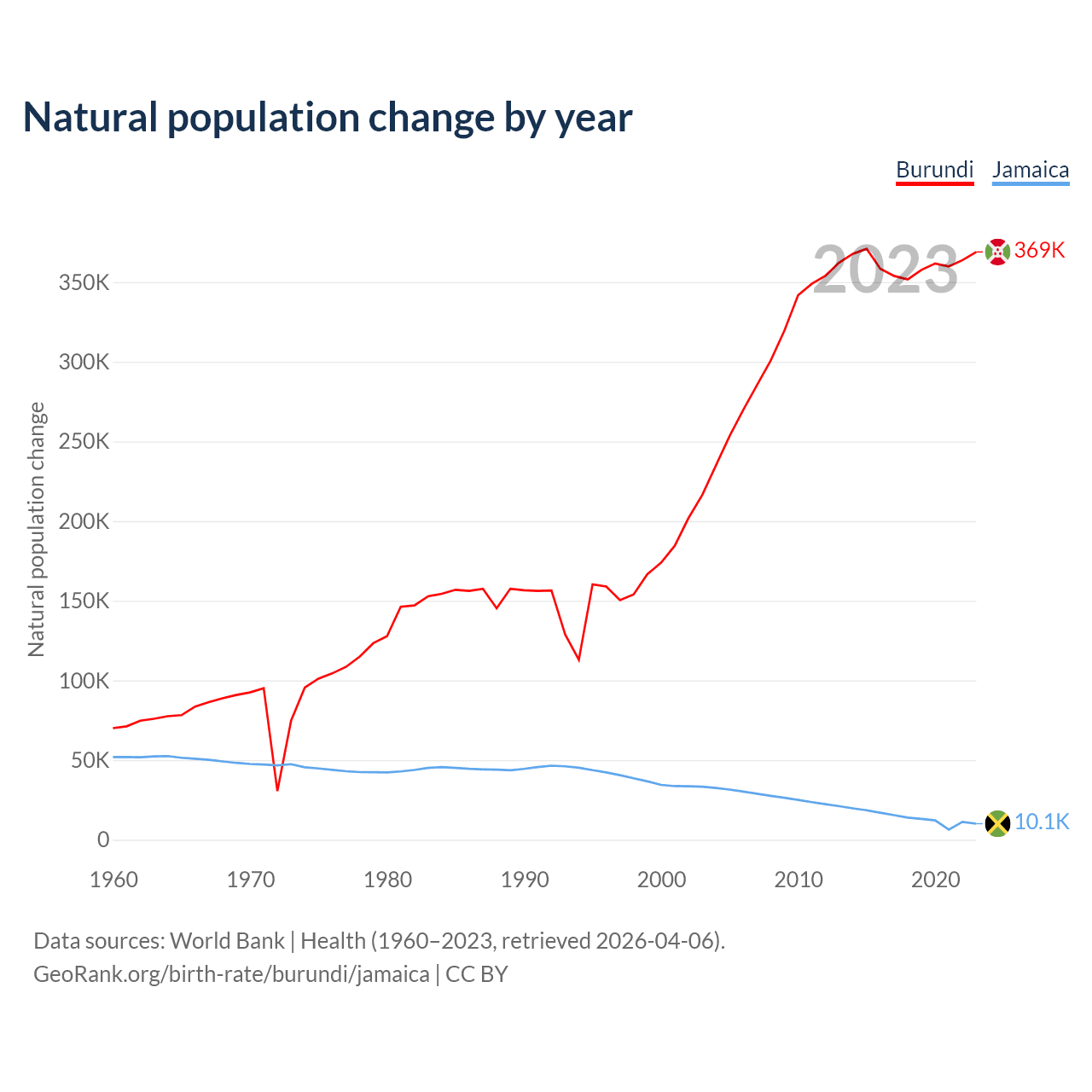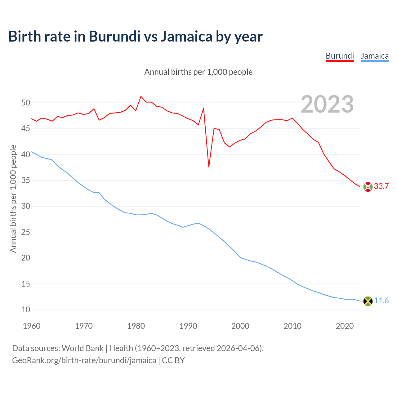 Burundi has an annual birth rate of 33.7 births per 1,000 people, compared to 11.6 for Jamaica. The average number of children a woman is expected to have during her lifetime — the fertility rate, is 4.88 in Burundi and 1.36 in Jamaica — 72.2% difference.