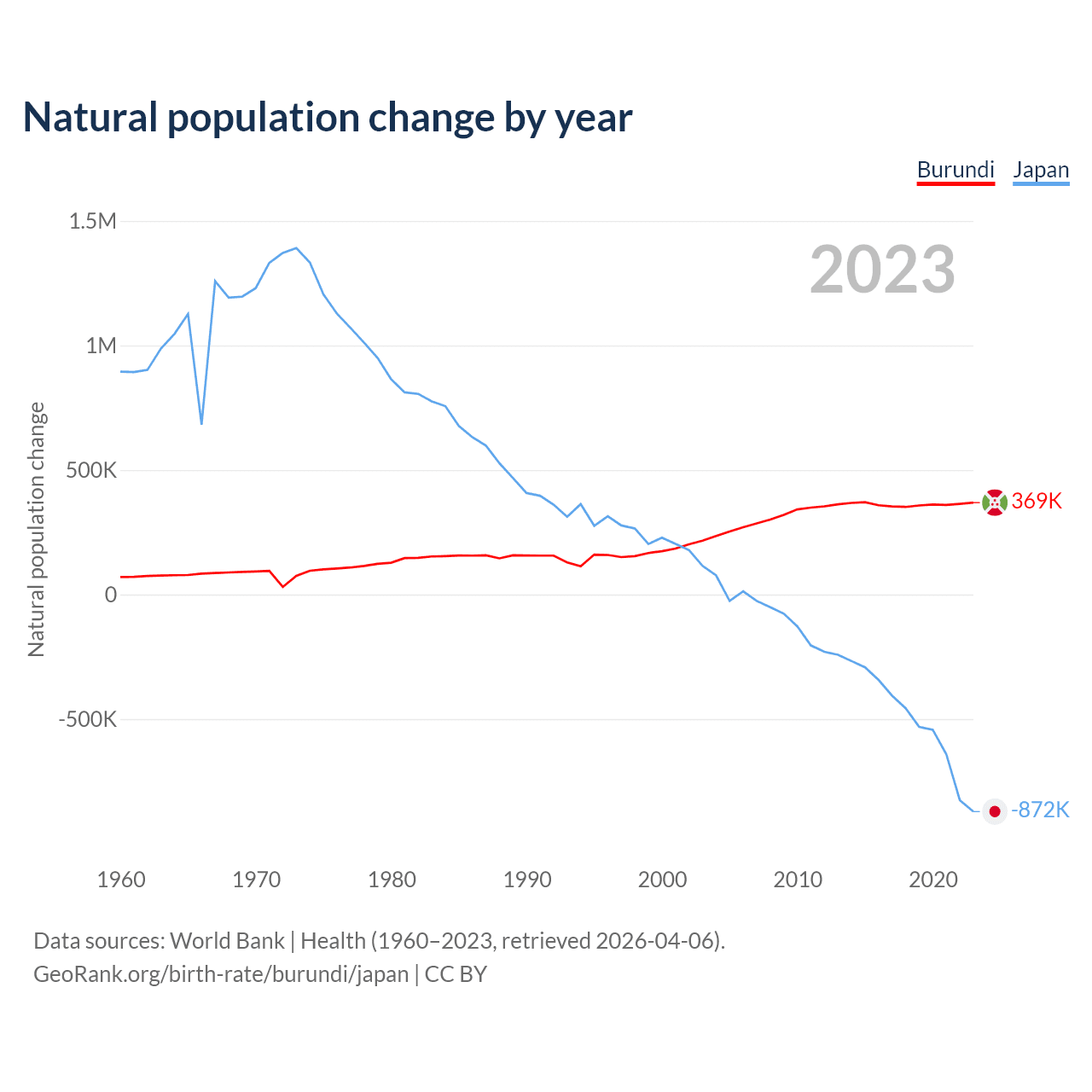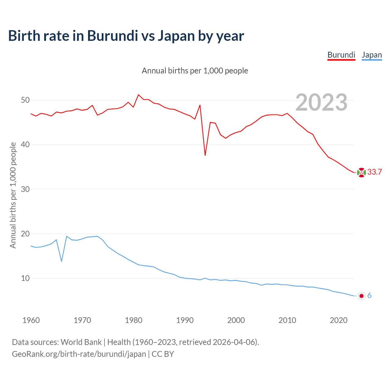 Burundi has an annual birth rate of 33.7 births per 1,000 people, compared to 6 for Japan. The average number of children a woman is expected to have during her lifetime — the fertility rate, is 4.88 in Burundi and 1.2 in Japan — 75.4% difference.