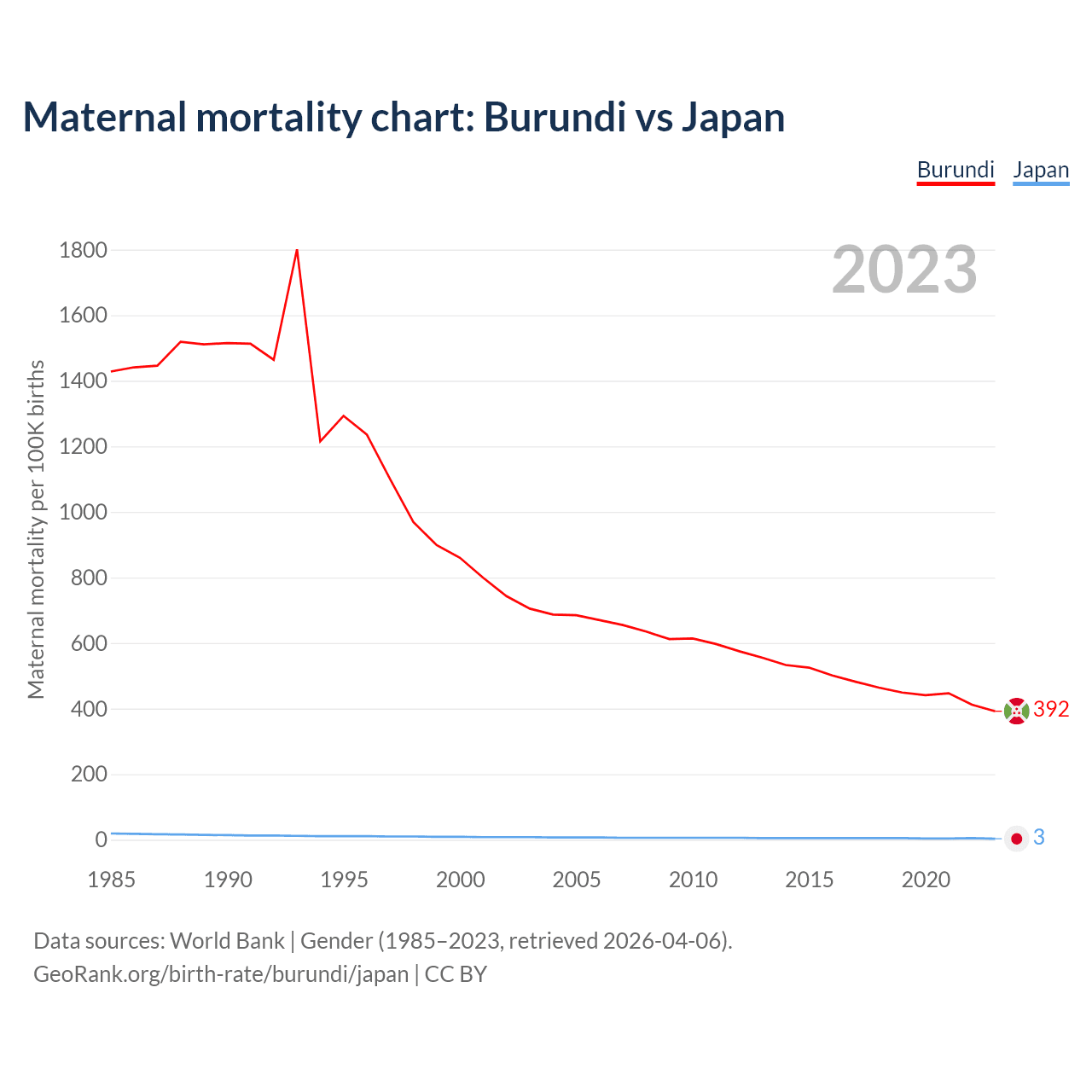 The maternal mortality rate, which is the probability of dying during childbirth or within 42 days of pregnancy termination, is 392 deaths per 100,000 live births in Burundi, compared to 3 deaths in Japan.