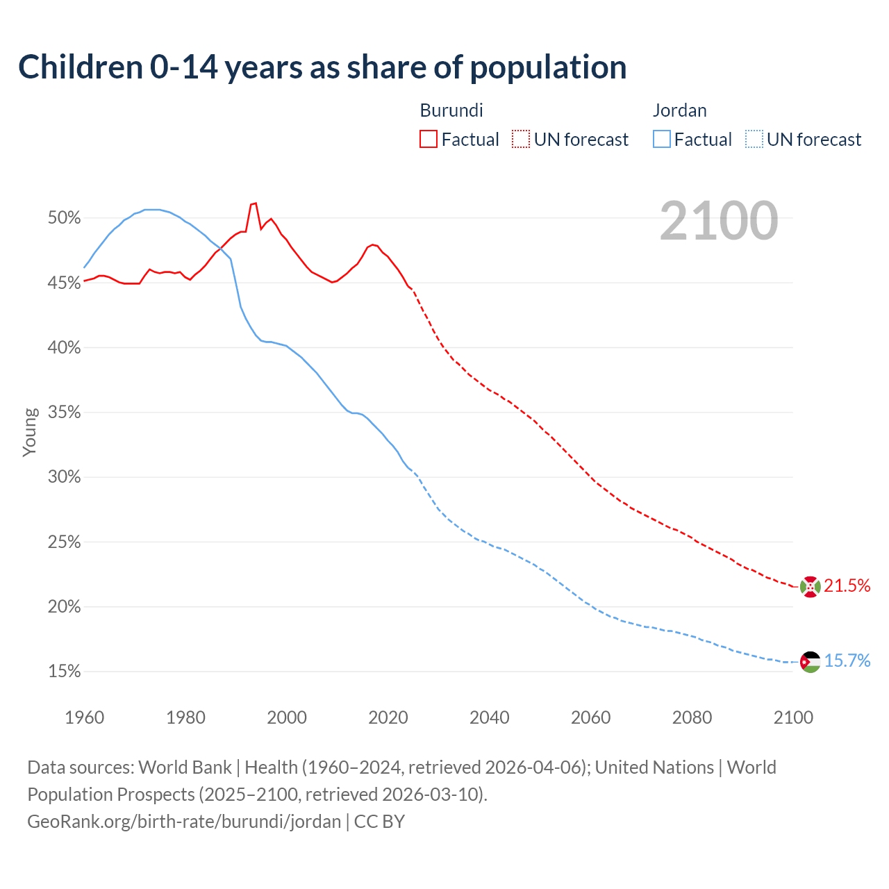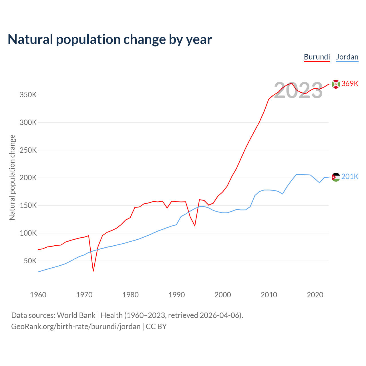 Burundi has an annual birth rate of 33.7 births per 1,000 people, compared to 20.6 for Jordan. The average number of children a woman is expected to have during her lifetime — the fertility rate, is 4.88 in Burundi and 2.64 in Jordan — 45.9% difference.