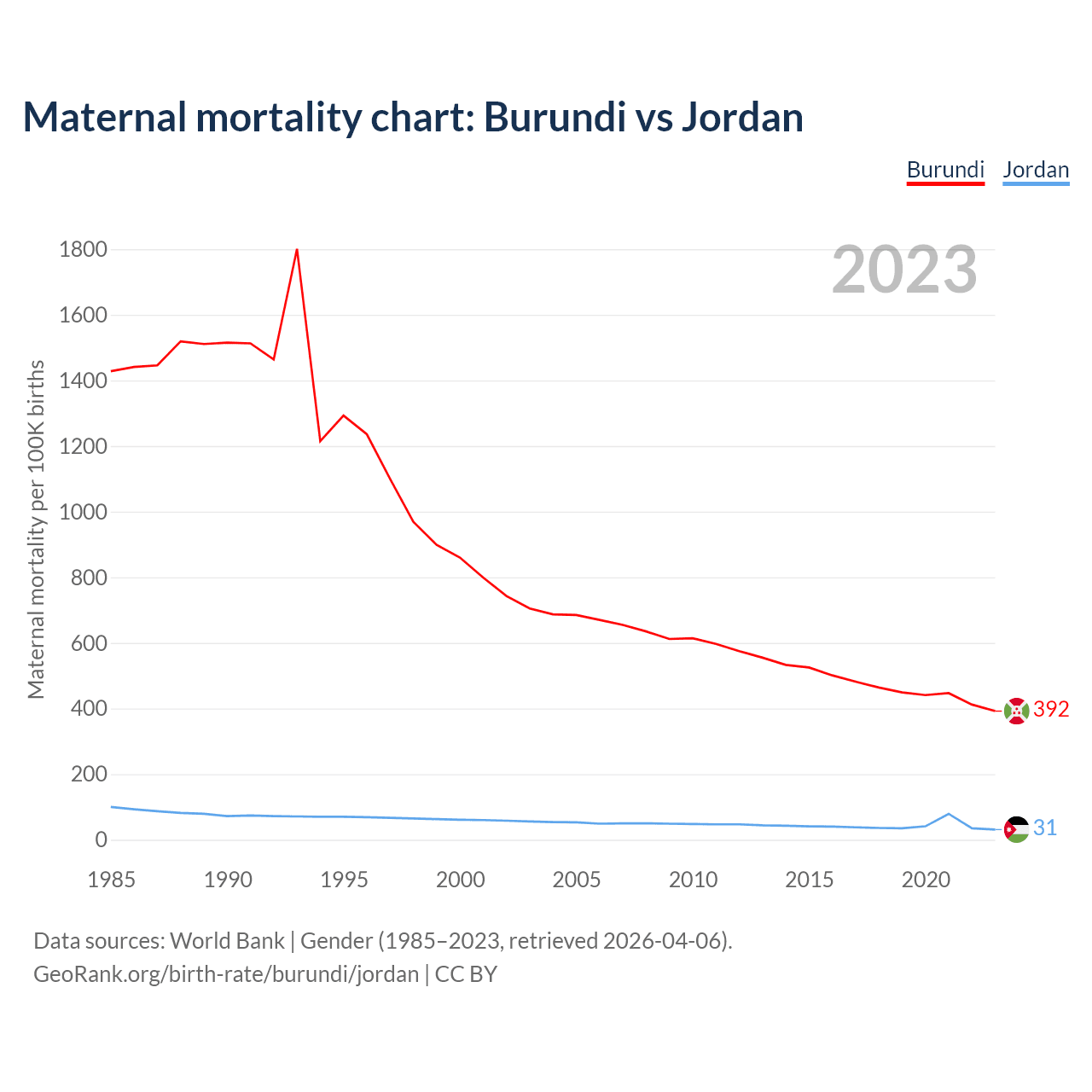 The maternal mortality rate, which is the probability of dying during childbirth or within 42 days of pregnancy termination, is 392 deaths per 100,000 live births in Burundi, compared to 31 deaths in Jordan.