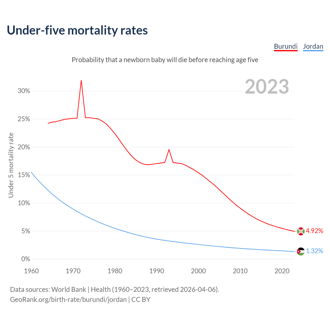 The chance that a newborn baby will die before reaching age five is 4.92% in Burundi and 1.32% in Jordan. Above is a chart with historical data on under-five mortality rates.