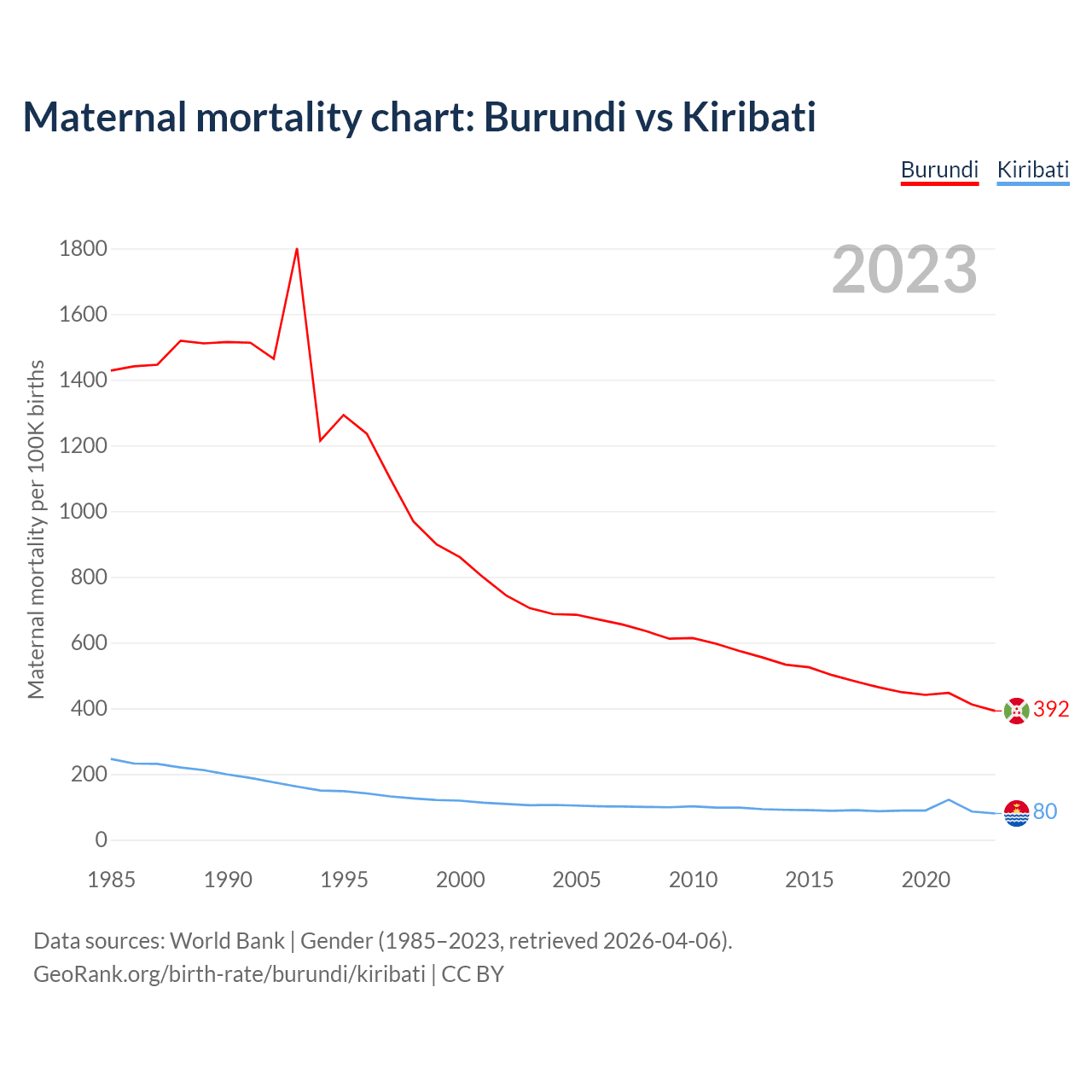 The maternal mortality rate, which is the probability of dying during childbirth or within 42 days of pregnancy termination, is 392 deaths per 100,000 live births in Burundi, compared to 80 deaths in Kiribati.