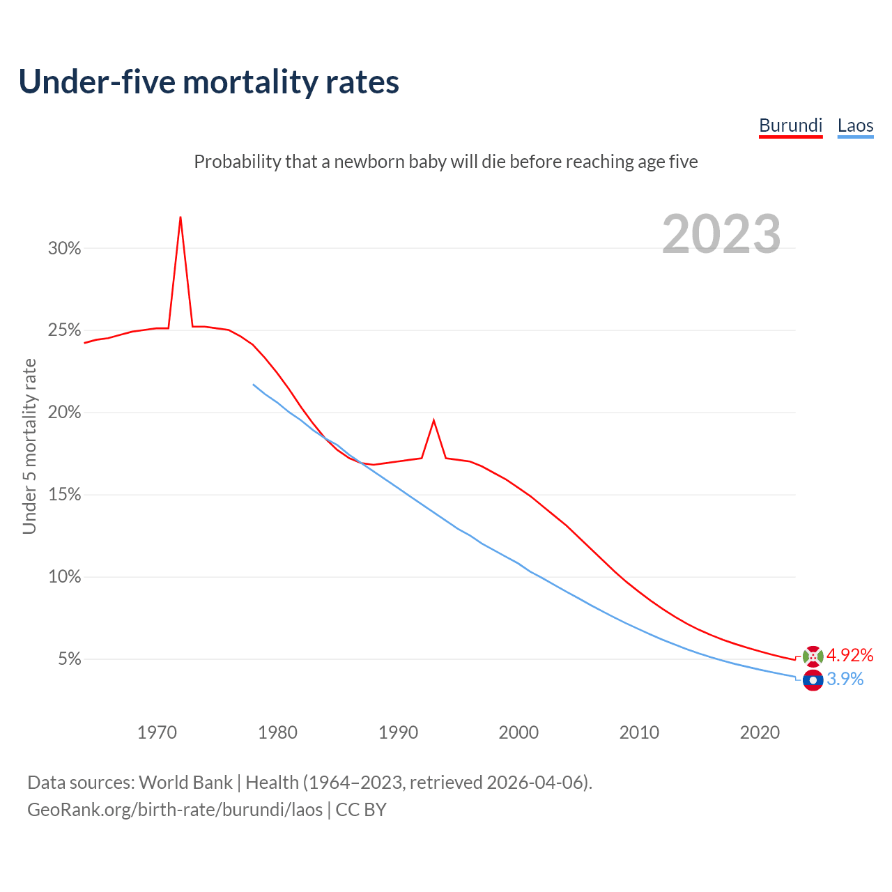 The chance that a newborn baby will die before reaching age five is 4.92% in Burundi and 3.9% in Laos. Above is a chart with historical data on under-five mortality rates.