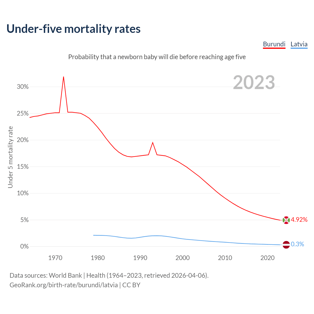 The chance that a newborn baby will die before reaching age five is 4.92% in Burundi and 0.3% in Latvia. Above is a chart with historical data on under-five mortality rates.