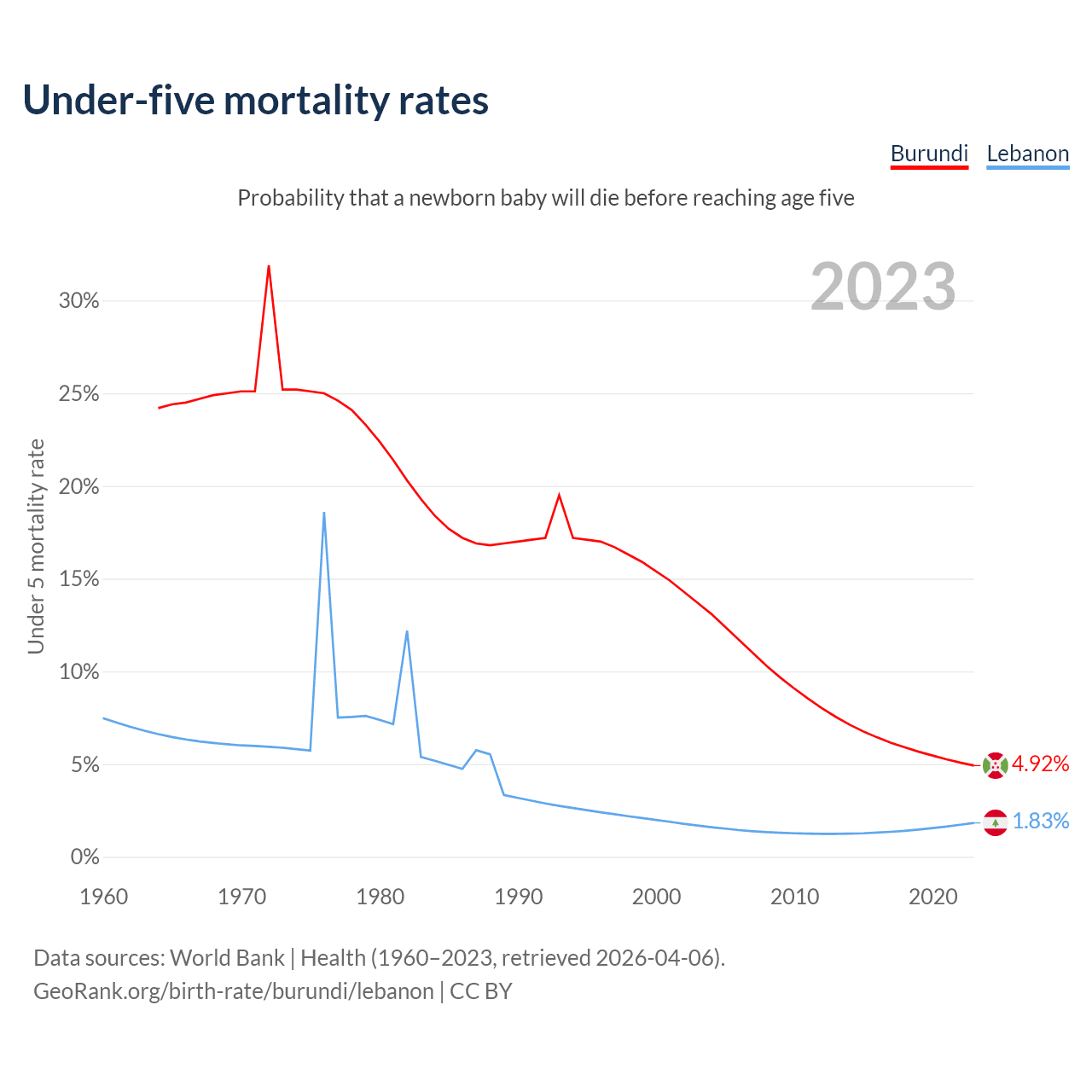 The chance that a newborn baby will die before reaching age five is 4.92% in Burundi and 1.83% in Lebanon. Above is a chart with historical data on under-five mortality rates.