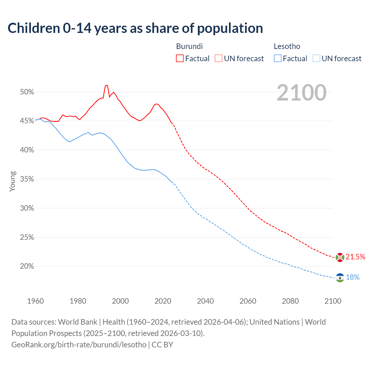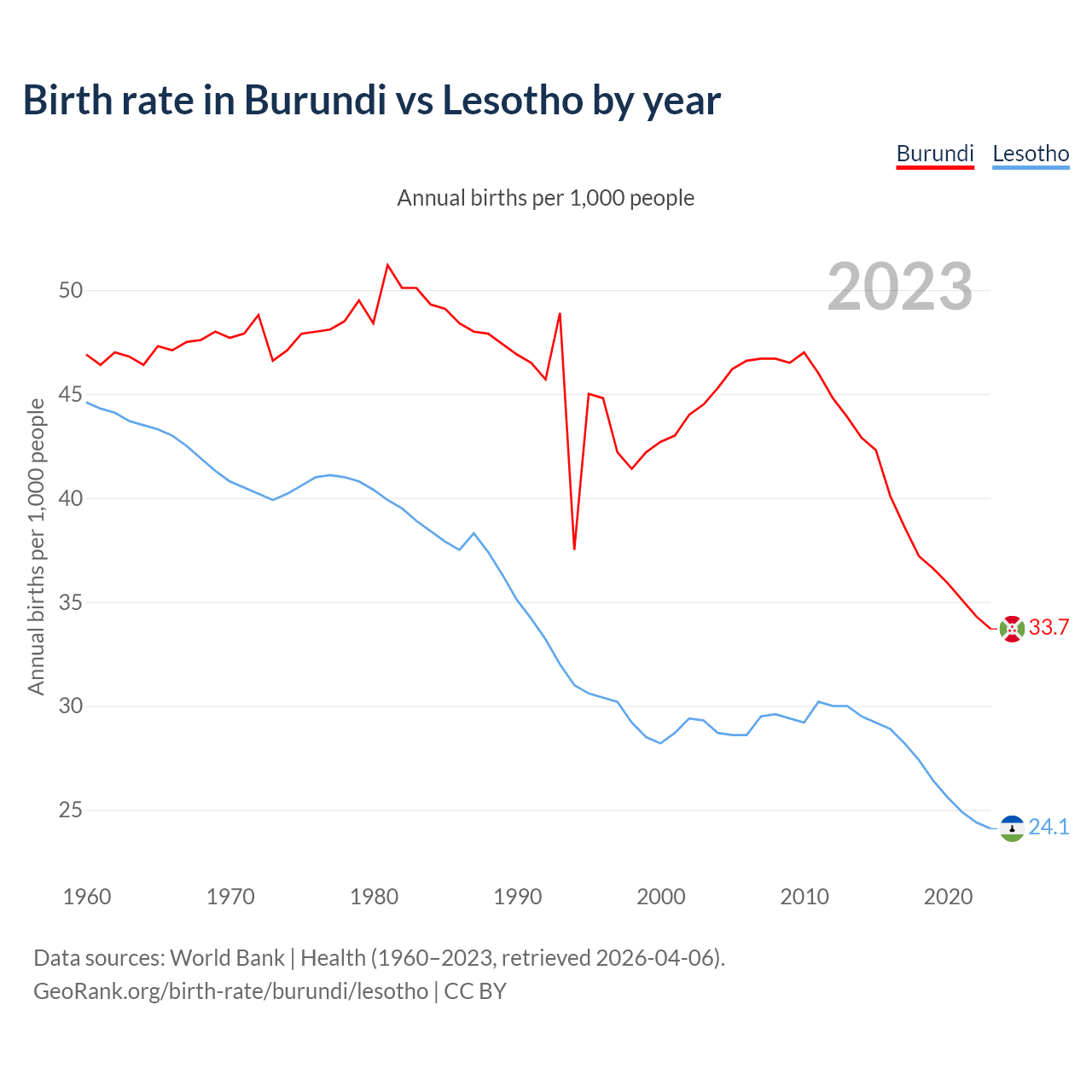 Burundi has an annual birth rate of 33.7 births per 1,000 people, compared to 24.1 for Lesotho. The average number of children a woman is expected to have during her lifetime — the fertility rate, is 4.88 in Burundi and 2.69 in Lesotho — 44.8% difference.