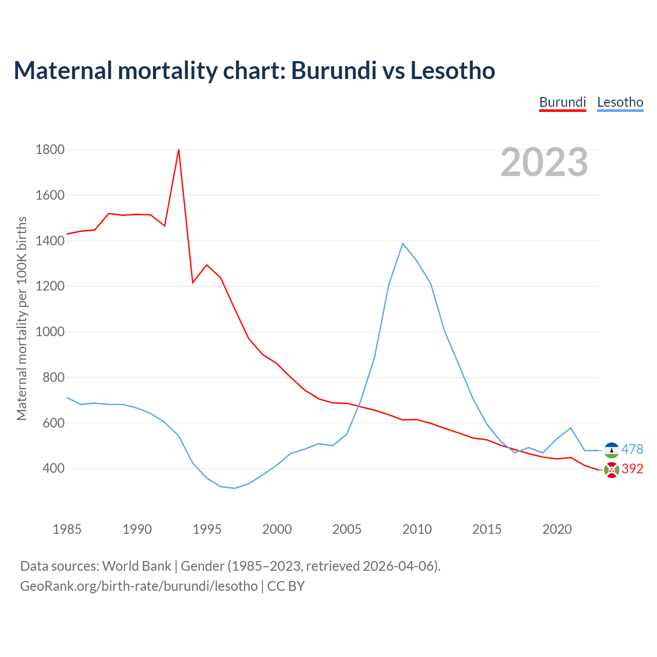 The maternal mortality rate, which is the probability of dying during childbirth or within 42 days of pregnancy termination, is 392 deaths per 100,000 live births in Burundi, compared to 478 deaths in Lesotho.