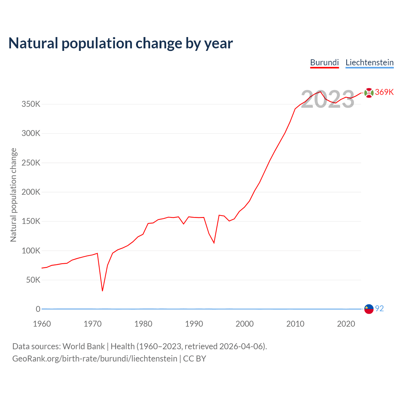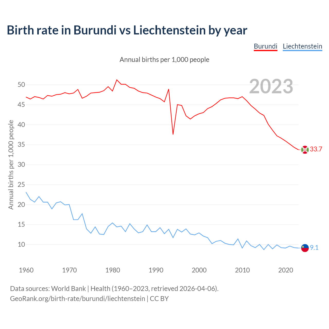 Burundi has an annual birth rate of 33.7 births per 1,000 people, compared to 9.1 for Liechtenstein. The average number of children a woman is expected to have during her lifetime — the fertility rate, is 4.88 in Burundi and 1.45 in Liechtenstein — 70.3% difference.