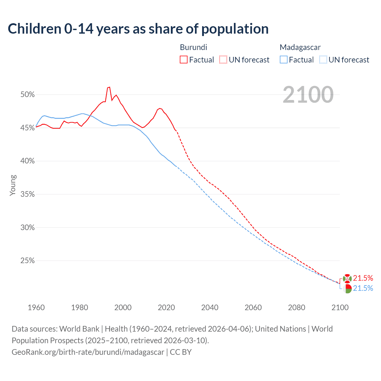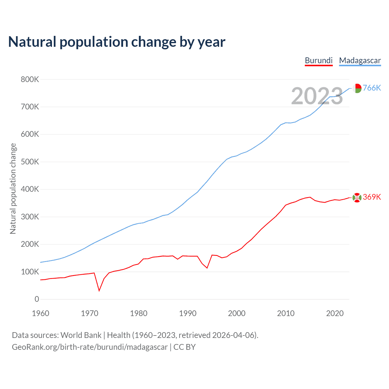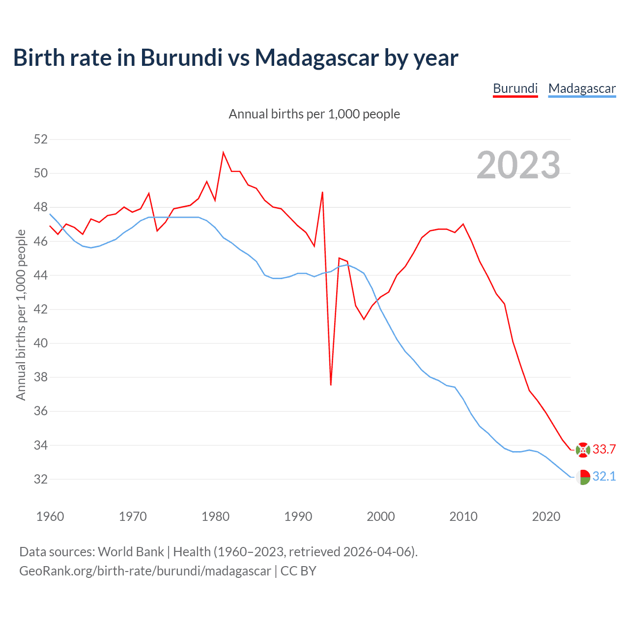 Burundi has an annual birth rate of 33.7 births per 1,000 people, compared to 32.1 for Madagascar. The average number of children a woman is expected to have during her lifetime — the fertility rate, is 4.88 in Burundi and 3.97 in Madagascar — 18.6% difference.