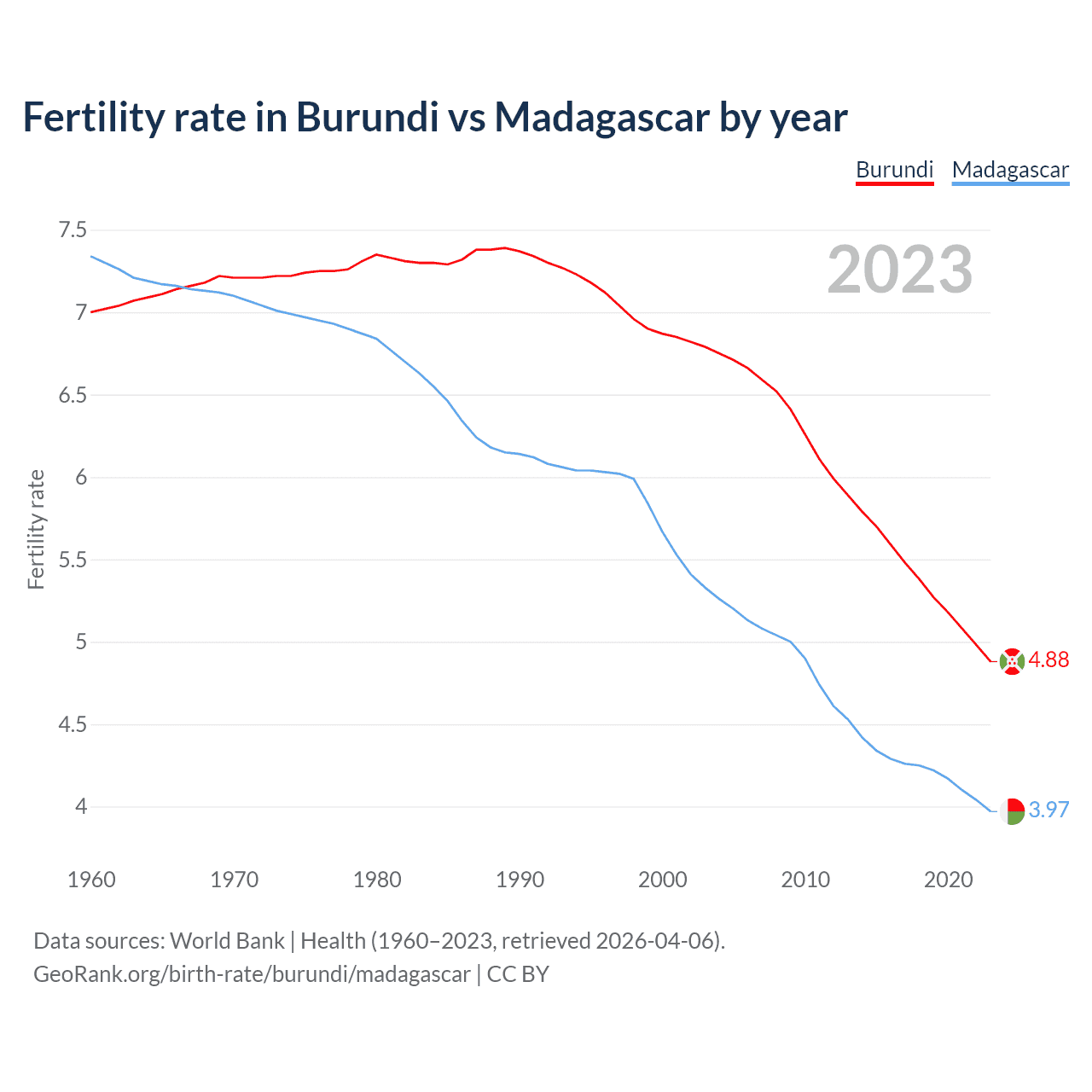According to the latest available data on birth rates, the fertility rate in Burundi was 4.88 children per woman in 2023, compared to 3.97 in Madagascar in 2023. The replacement level is considered to be 2.1 children per woman.