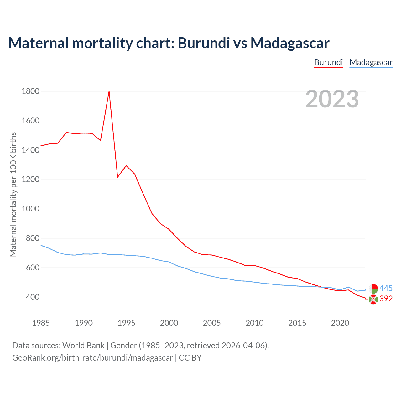 The maternal mortality rate, which is the probability of dying during childbirth or within 42 days of pregnancy termination, is 392 deaths per 100,000 live births in Burundi, compared to 445 deaths in Madagascar.