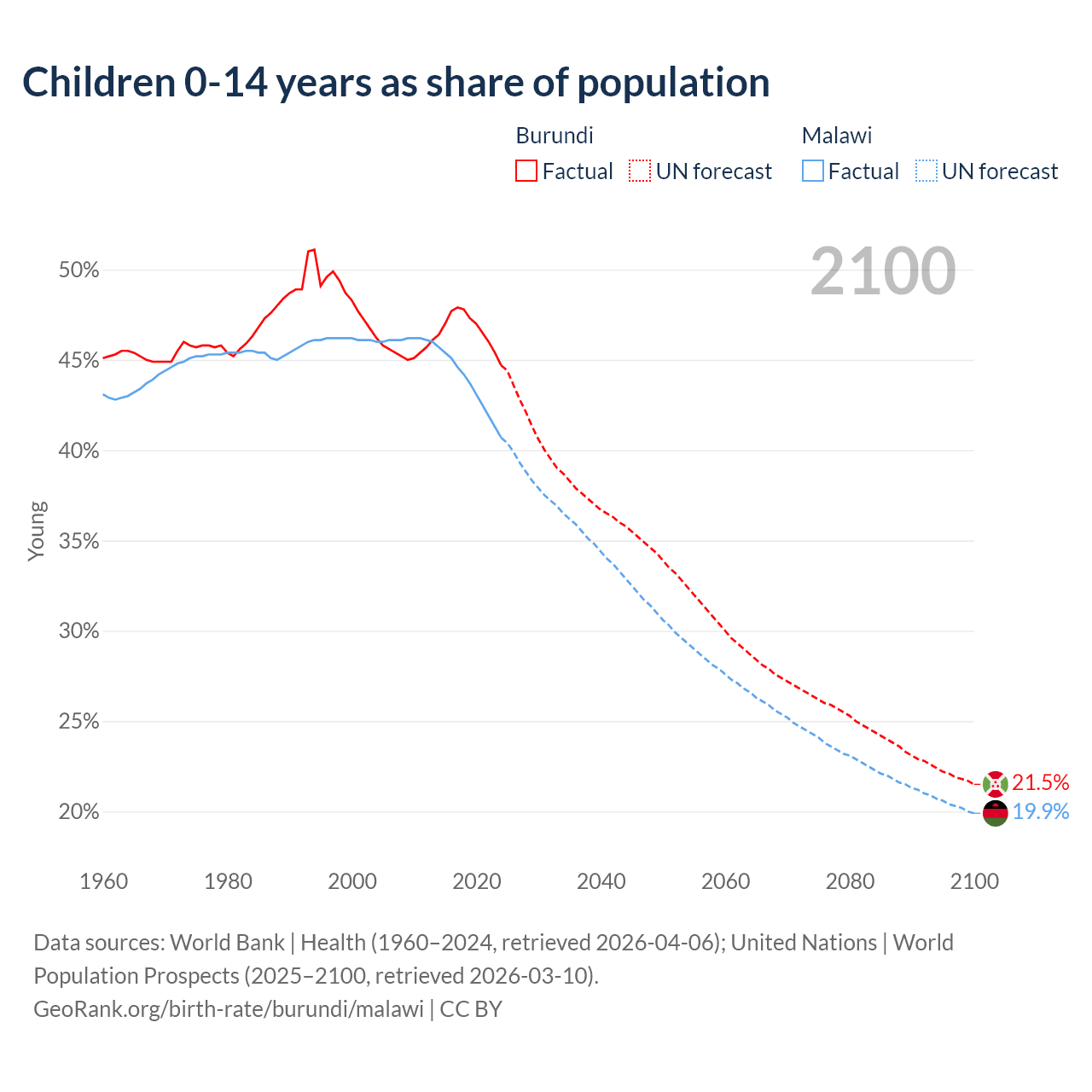 According to the latest available data on birth rates, the fertility rate in Burundi was 4.88 children per woman in 2023, compared to 3.65 in Malawi in 2023. The replacement level is considered to be 2.1 children per woman.
