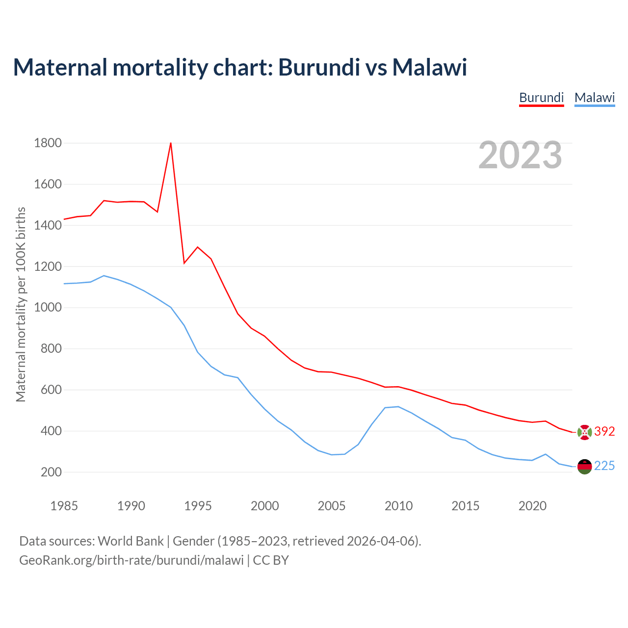 The maternal mortality rate, which is the probability of dying during childbirth or within 42 days of pregnancy termination, is 392 deaths per 100,000 live births in Burundi, compared to 225 deaths in Malawi.