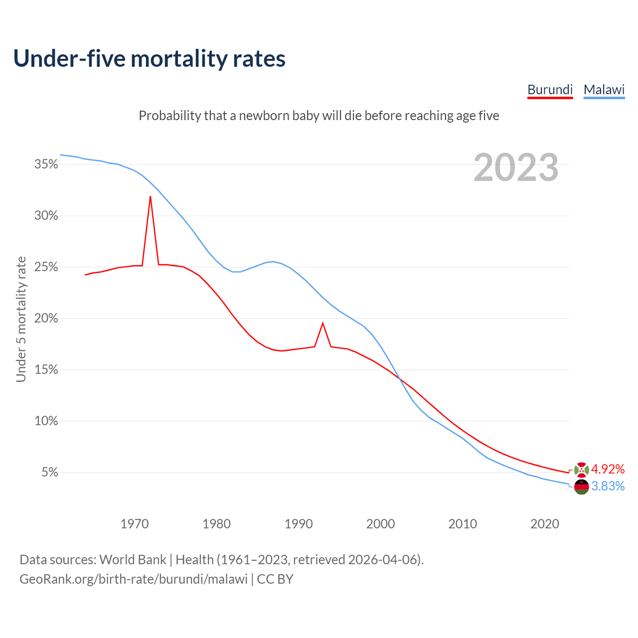 The chance that a newborn baby will die before reaching age five is 4.92% in Burundi and 3.83% in Malawi. Above is a chart with historical data on under-five mortality rates.