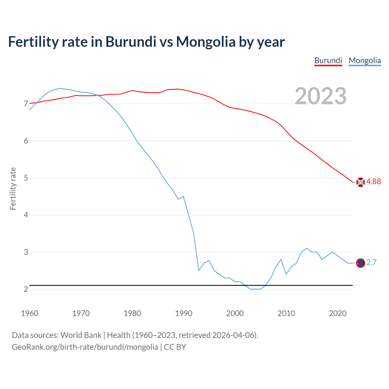 According to the latest available data on birth rates, the fertility rate in Burundi was 4.88 children per woman in 2023, compared to 2.7 in Mongolia in 2023. The replacement level is considered to be 2.1 children per woman.