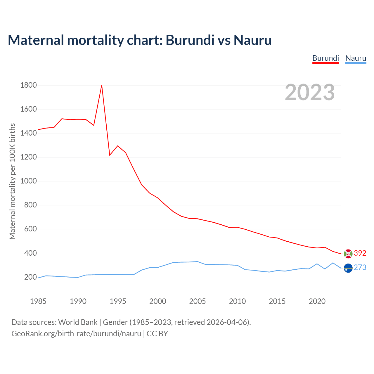 The maternal mortality rate, which is the probability of dying during childbirth or within 42 days of pregnancy termination, is 392 deaths per 100,000 live births in Burundi, compared to 273 deaths in Nauru.