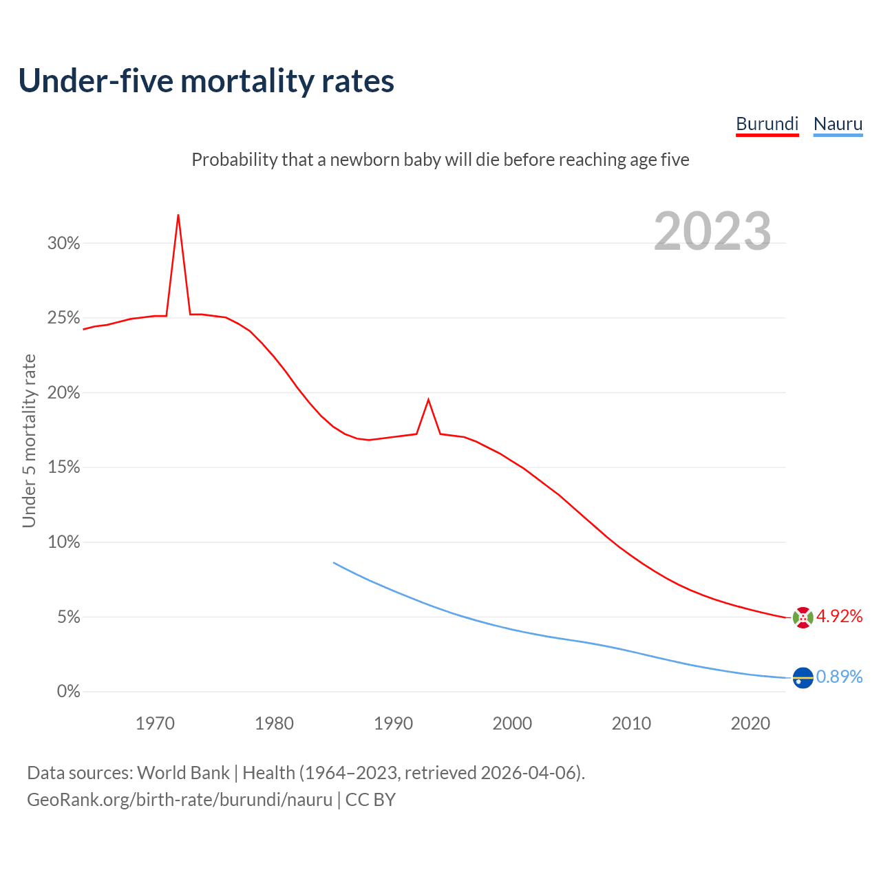The chance that a newborn baby will die before reaching age five is 4.92% in Burundi and 0.89% in Nauru. Above is a chart with historical data on under-five mortality rates.