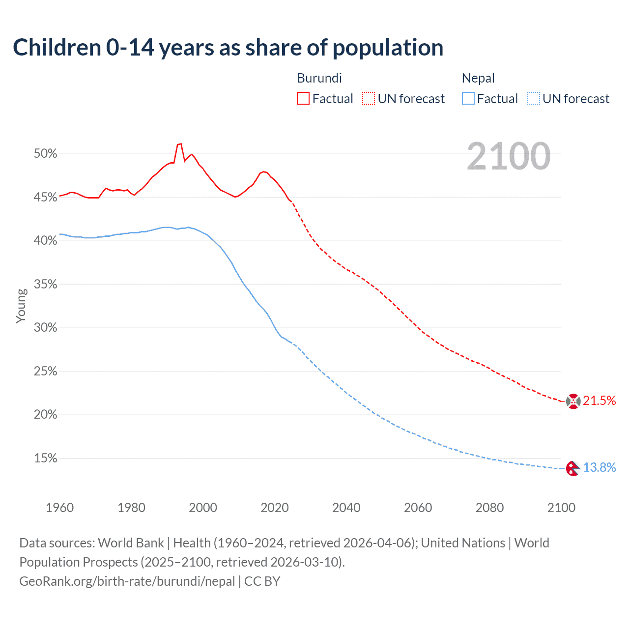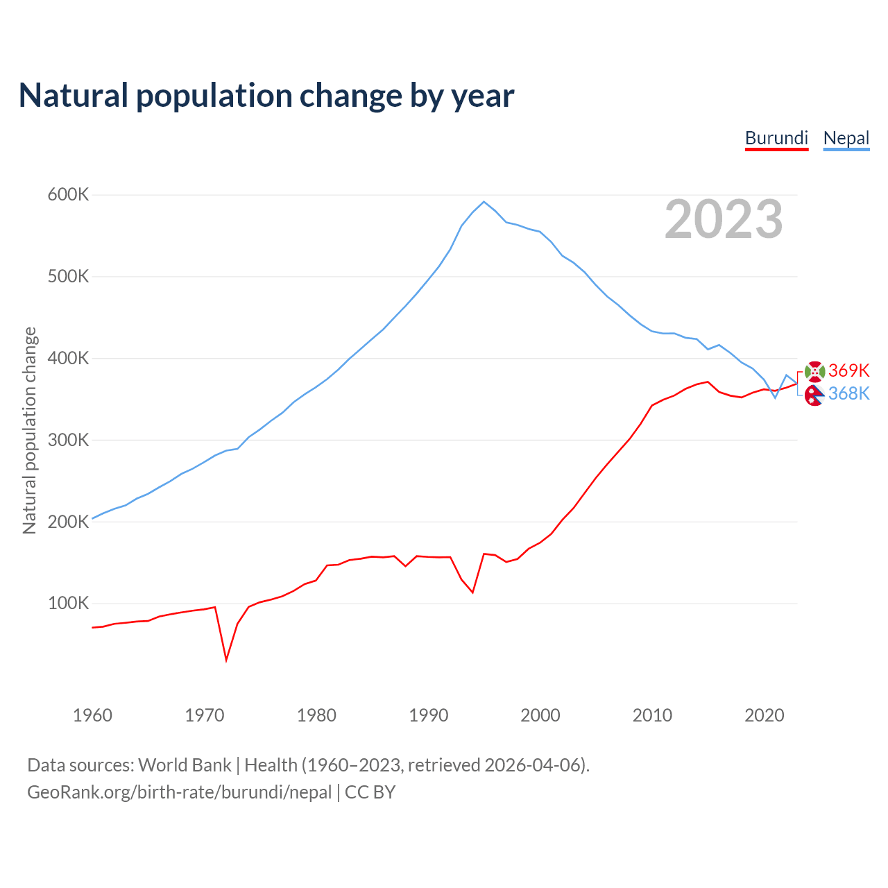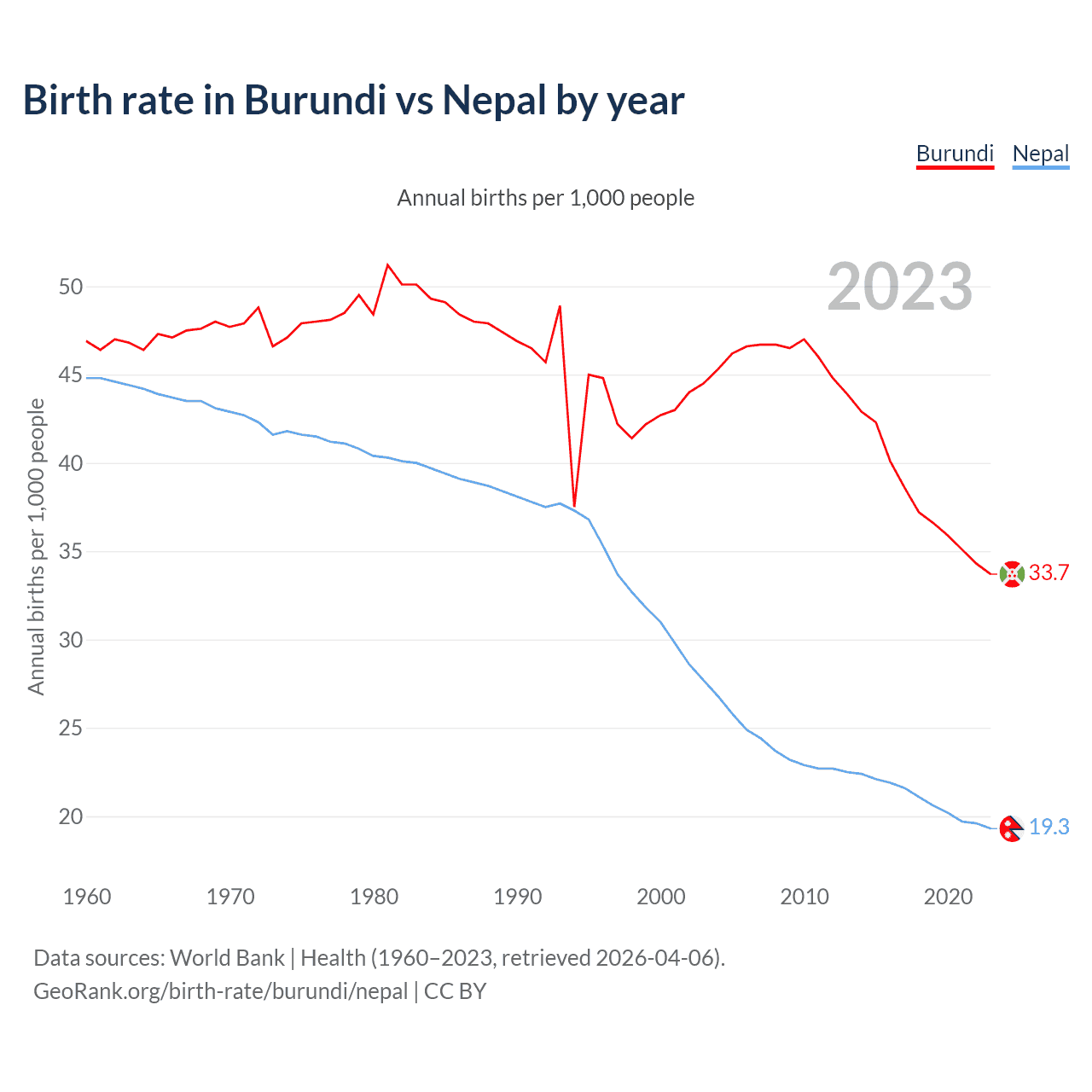 Burundi has an annual birth rate of 33.7 births per 1,000 people, compared to 19.3 for Nepal. The average number of children a woman is expected to have during her lifetime — the fertility rate, is 4.88 in Burundi and 1.98 in Nepal — 59.3% difference.