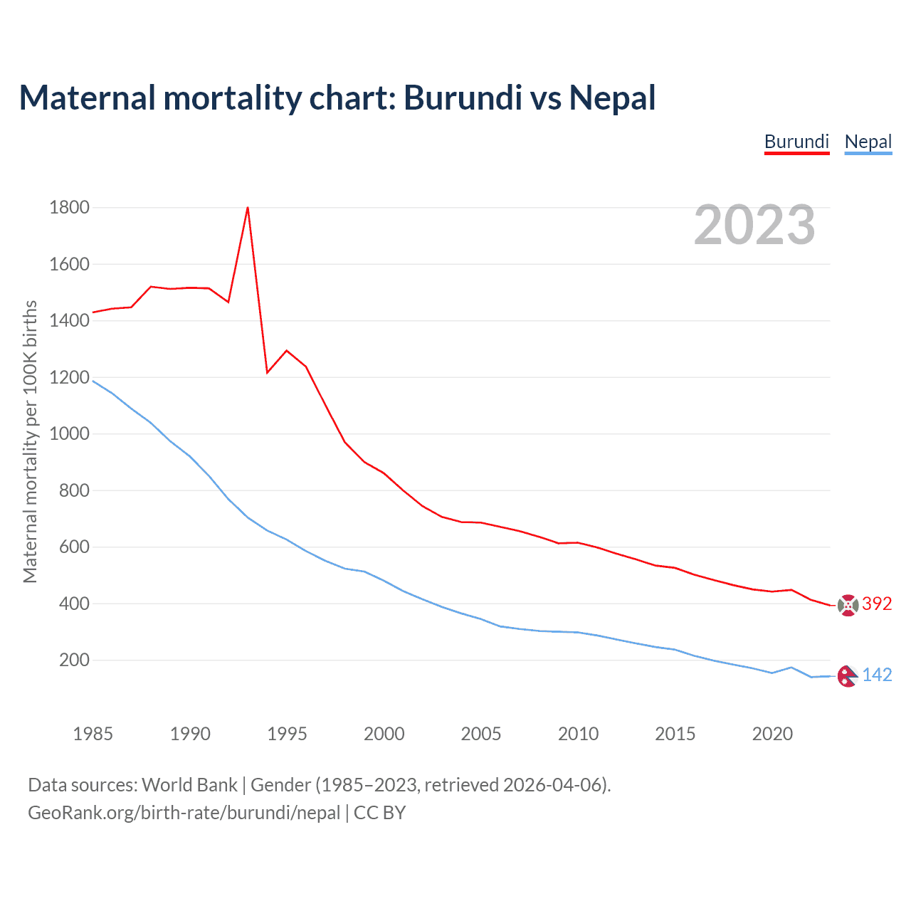 The maternal mortality rate, which is the probability of dying during childbirth or within 42 days of pregnancy termination, is 392 deaths per 100,000 live births in Burundi, compared to 142 deaths in Nepal.