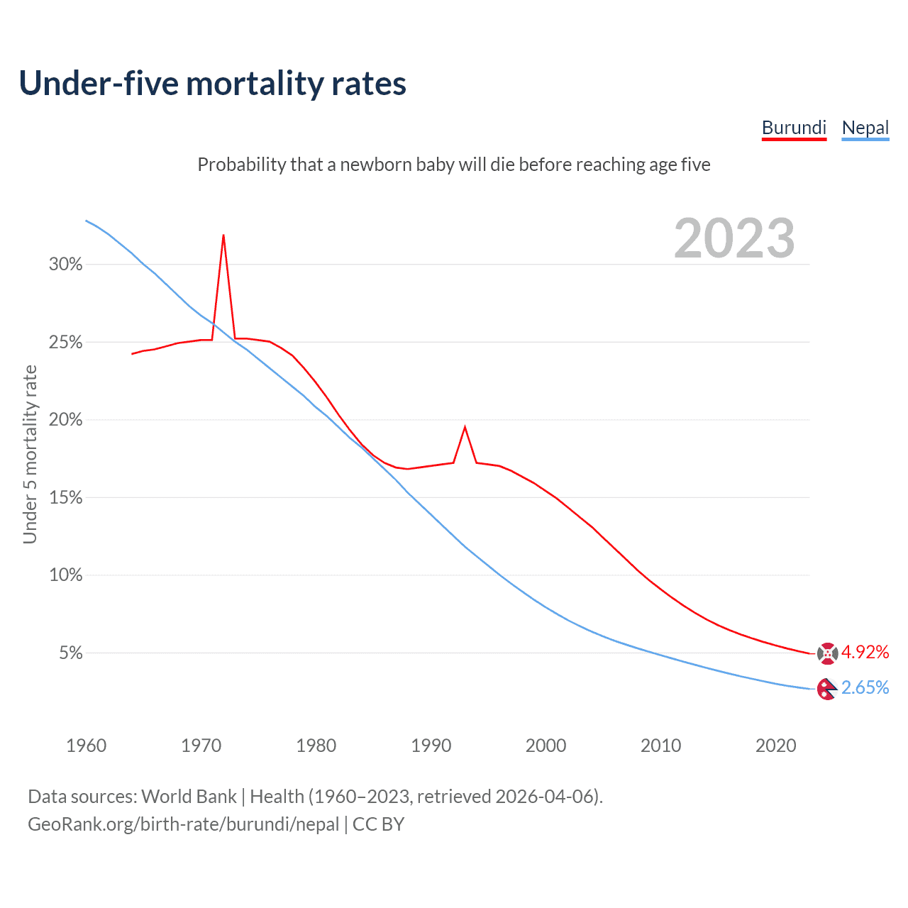 The chance that a newborn baby will die before reaching age five is 4.92% in Burundi and 2.65% in Nepal. Above is a chart with historical data on under-five mortality rates.