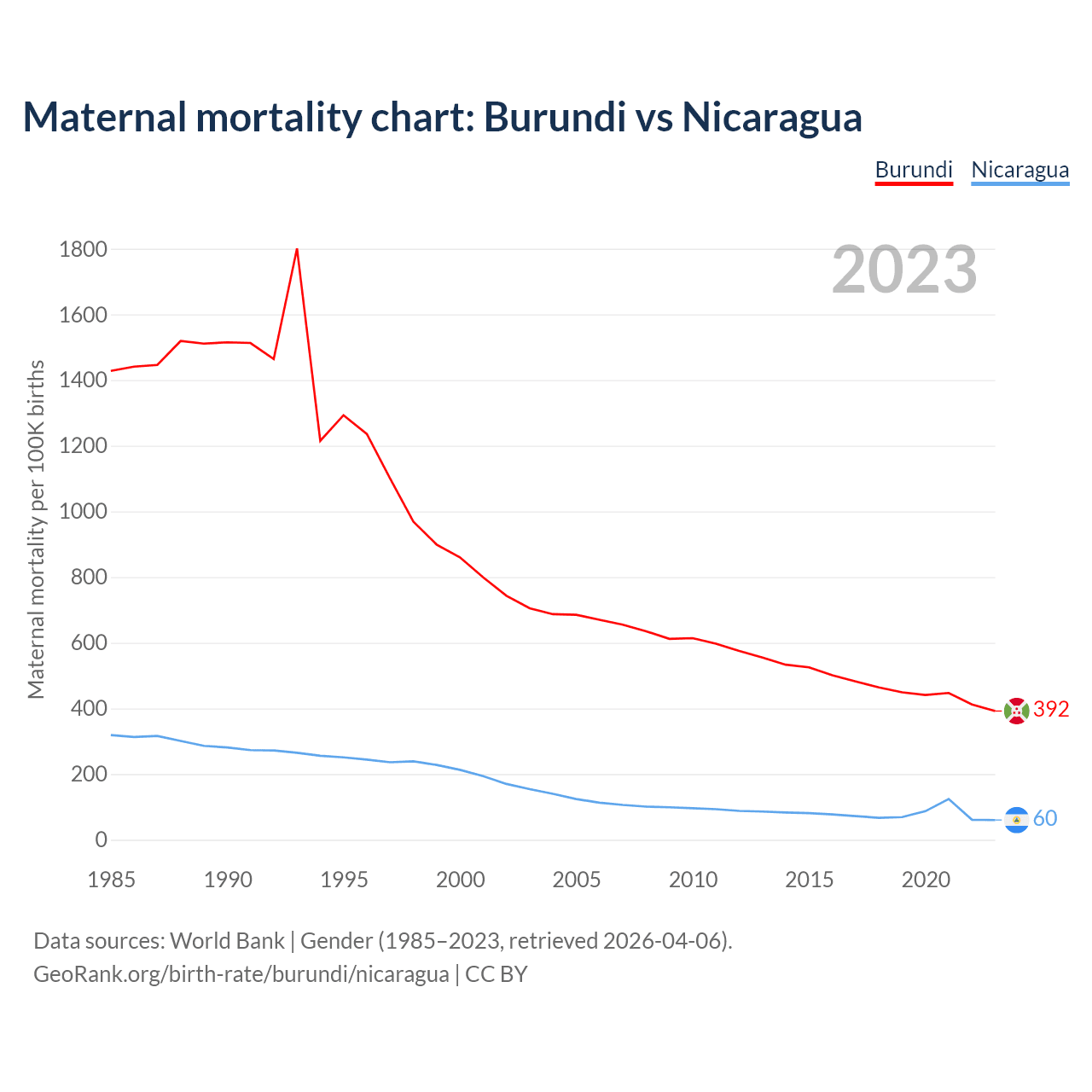 The maternal mortality rate, which is the probability of dying during childbirth or within 42 days of pregnancy termination, is 392 deaths per 100,000 live births in Burundi, compared to 60 deaths in Nicaragua.