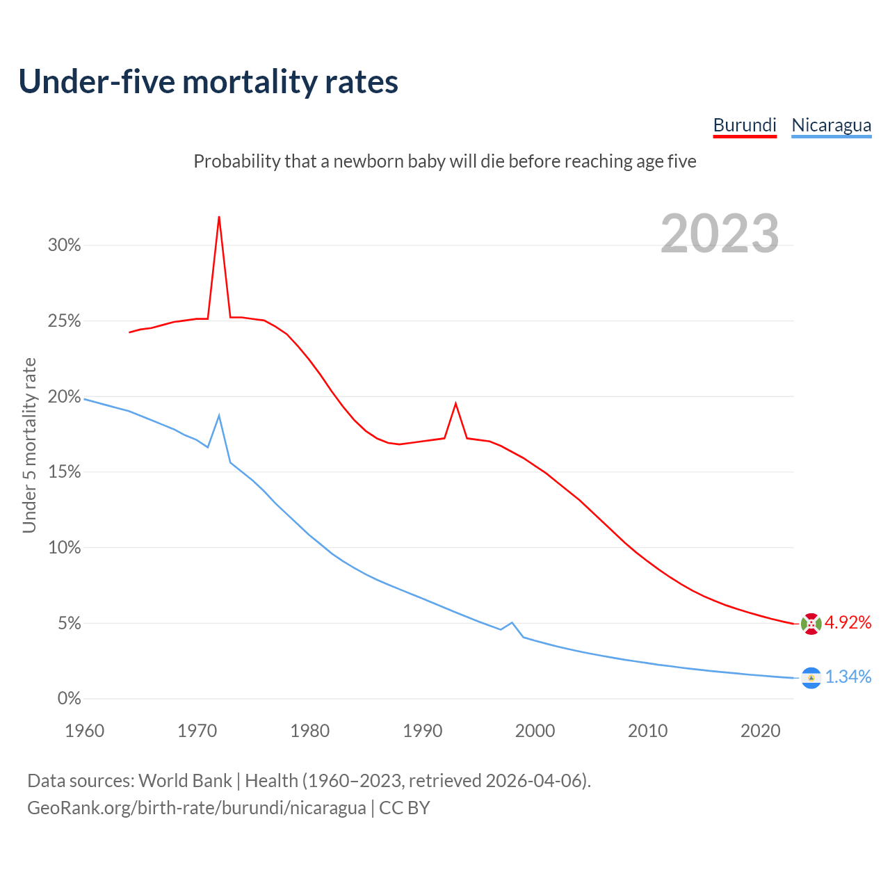 The chance that a newborn baby will die before reaching age five is 4.92% in Burundi and 1.34% in Nicaragua. Above is a chart with historical data on under-five mortality rates.