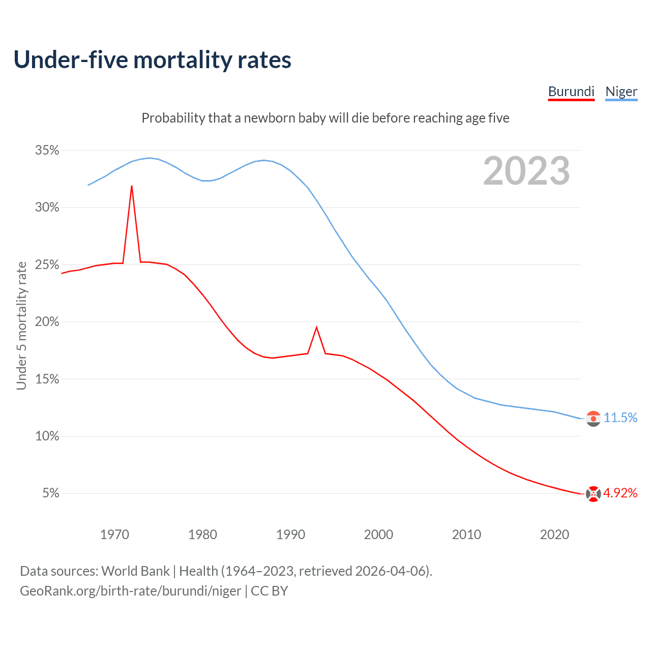 The chance that a newborn baby will die before reaching age five is 4.92% in Burundi and 11.5% in Niger. Above is a chart with historical data on under-five mortality rates.