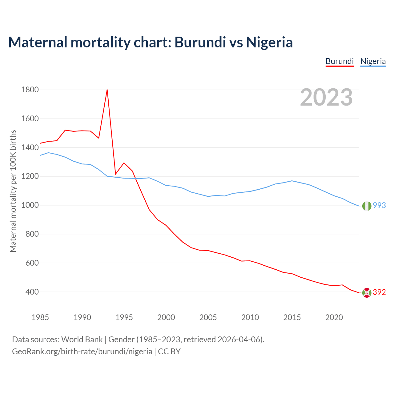 The maternal mortality rate, which is the probability of dying during childbirth or within 42 days of pregnancy termination, is 392 deaths per 100,000 live births in Burundi, compared to 993 deaths in Nigeria.