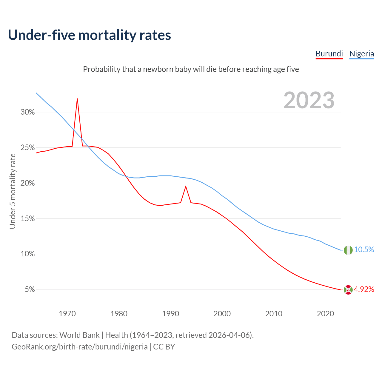 The chance that a newborn baby will die before reaching age five is 4.92% in Burundi and 10.5% in Nigeria. Above is a chart with historical data on under-five mortality rates.