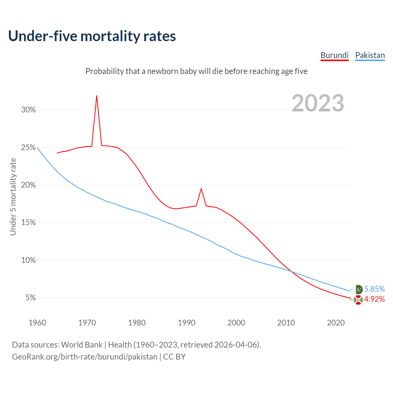 The chance that a newborn baby will die before reaching age five is 4.92% in Burundi and 5.85% in Pakistan. Above is a chart with historical data on under-five mortality rates.