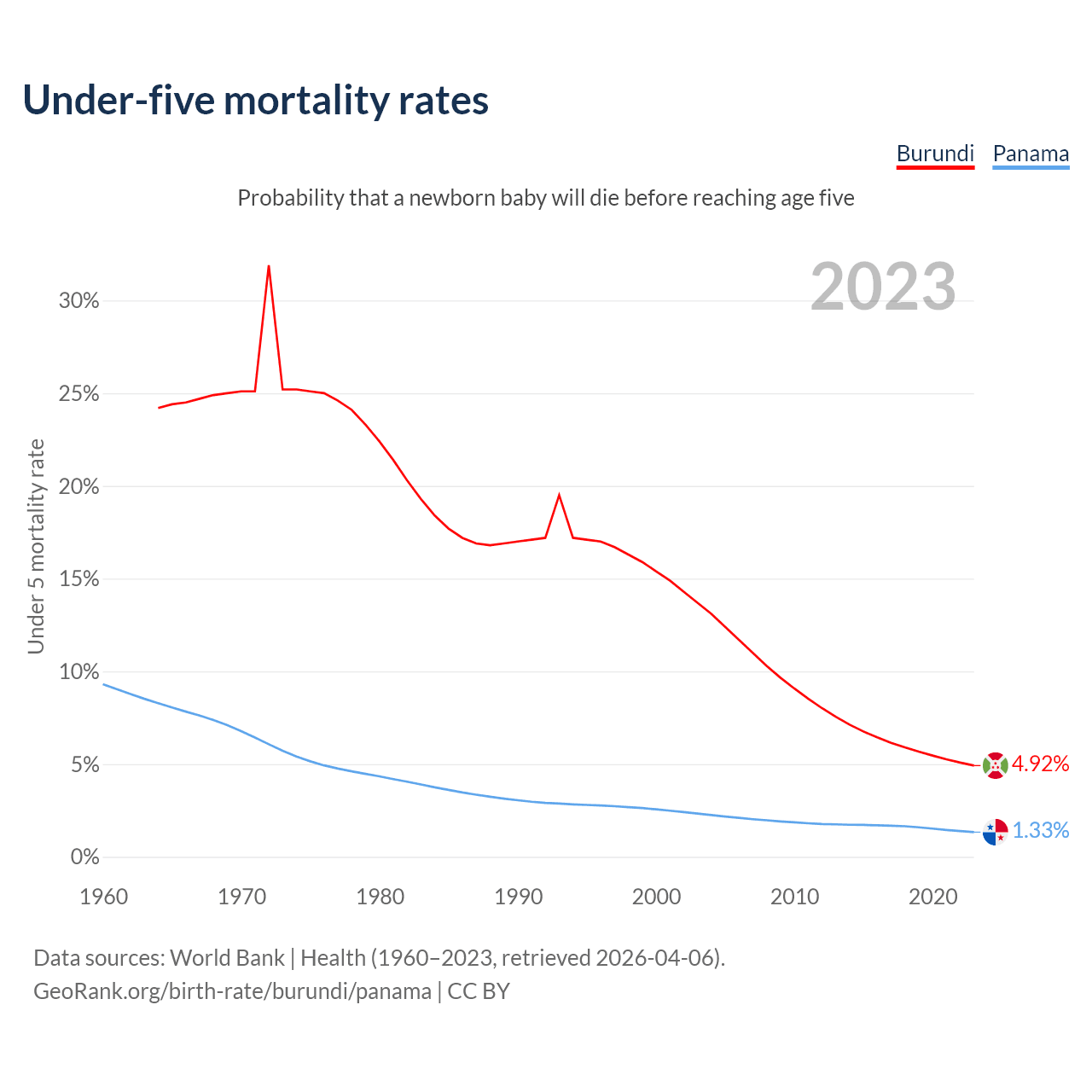 The chance that a newborn baby will die before reaching age five is 4.92% in Burundi and 1.33% in Panama. Above is a chart with historical data on under-five mortality rates.