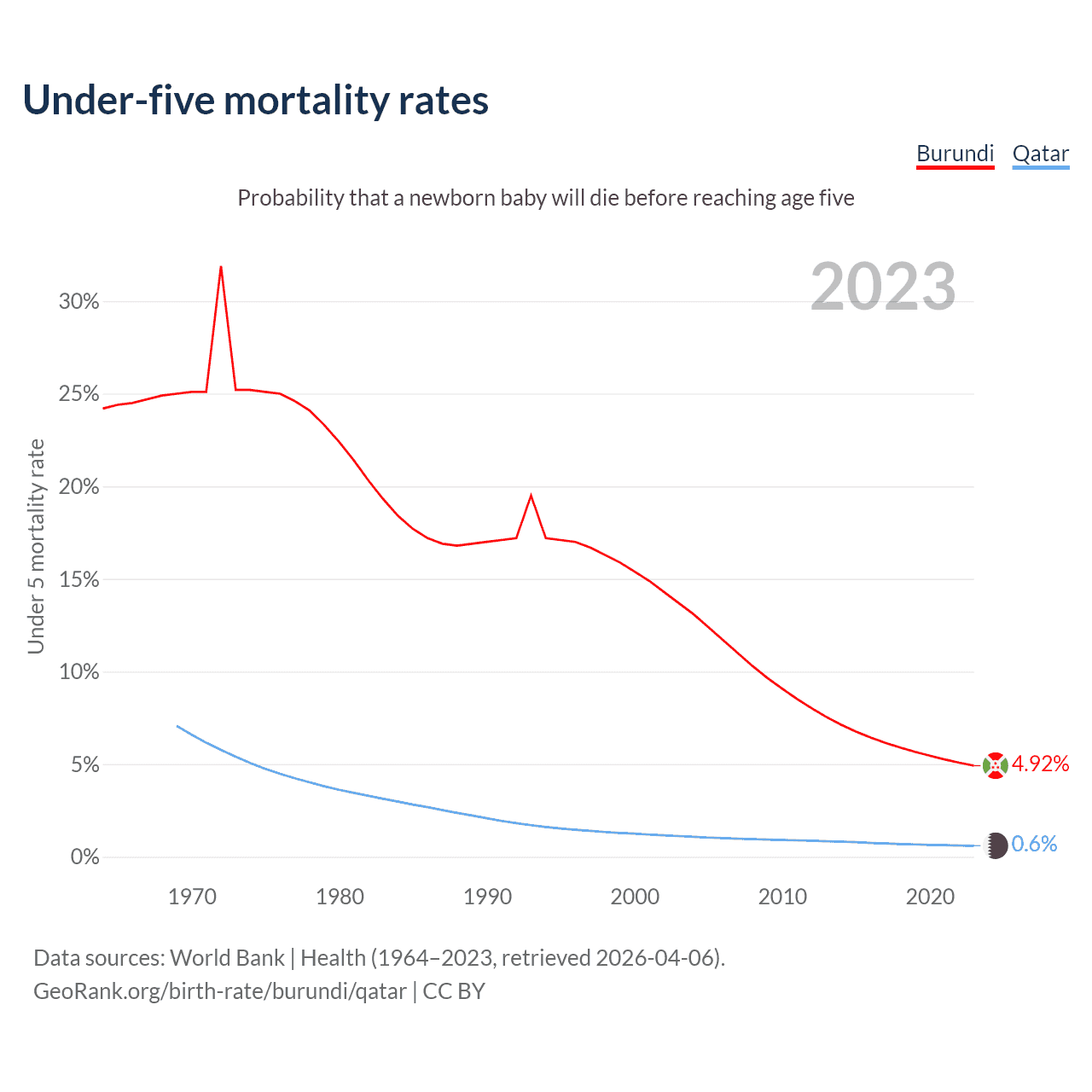 The chance that a newborn baby will die before reaching age five is 4.92% in Burundi and 0.6% in Qatar. Above is a chart with historical data on under-five mortality rates.