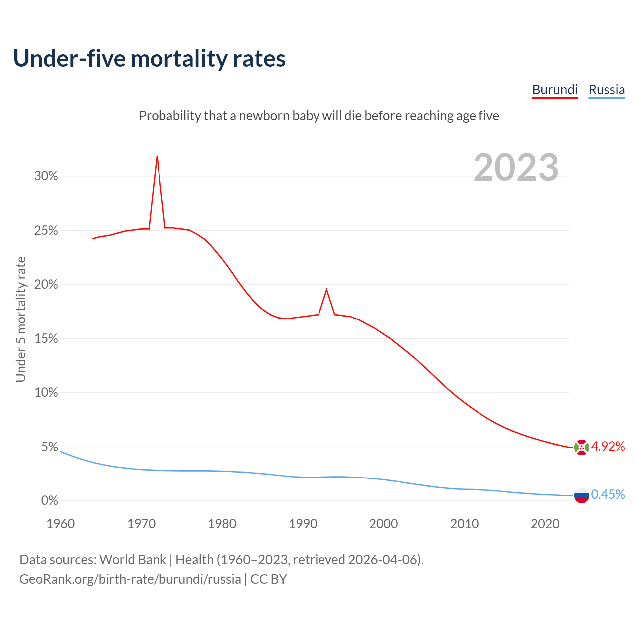 The chance that a newborn baby will die before reaching age five is 4.92% in Burundi and 0.45% in Russia. Above is a chart with historical data on under-five mortality rates.