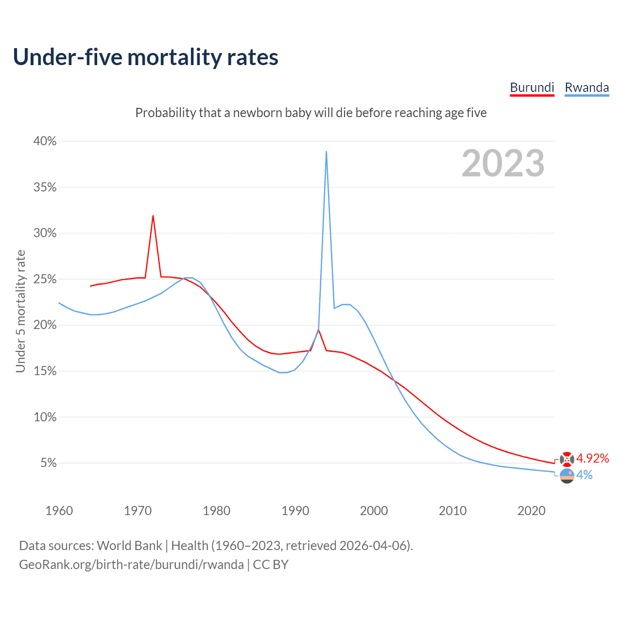 The chance that a newborn baby will die before reaching age five is 4.92% in Burundi and 4% in Rwanda. Above is a chart with historical data on under-five mortality rates.