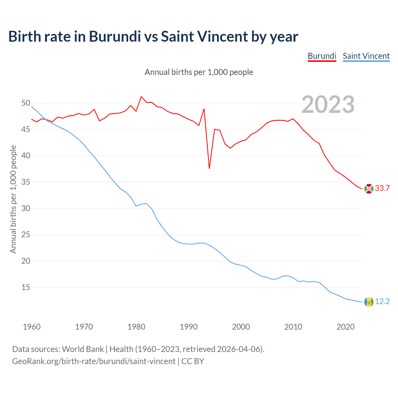 Burundi has an annual birth rate of 33.7 births per 1,000 people, compared to 12.2 for Saint Vincent. The average number of children a woman is expected to have during her lifetime — the fertility rate, is 4.88 in Burundi and 1.78 in Saint Vincent — 63.6% difference.